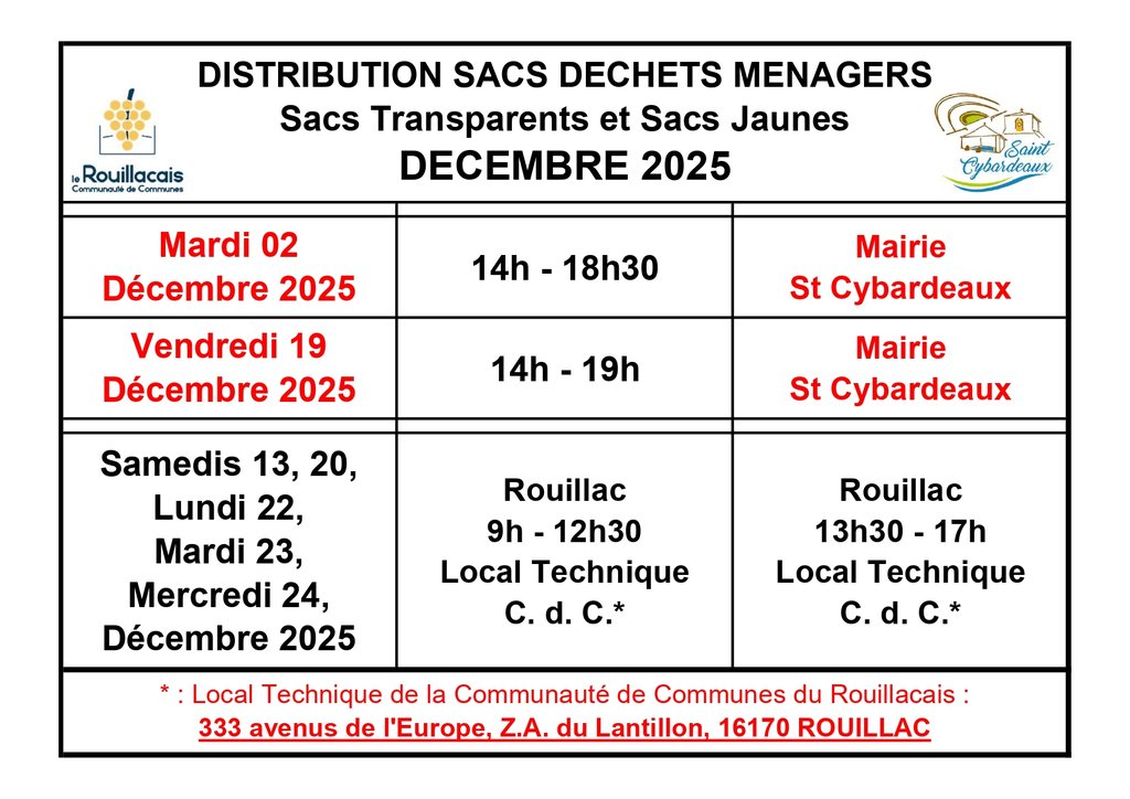 2 permanences sont prévues à la mairie de Saint-Cybardeaux, le mardi 02 décembre et le vendredi 19 décembre 2025