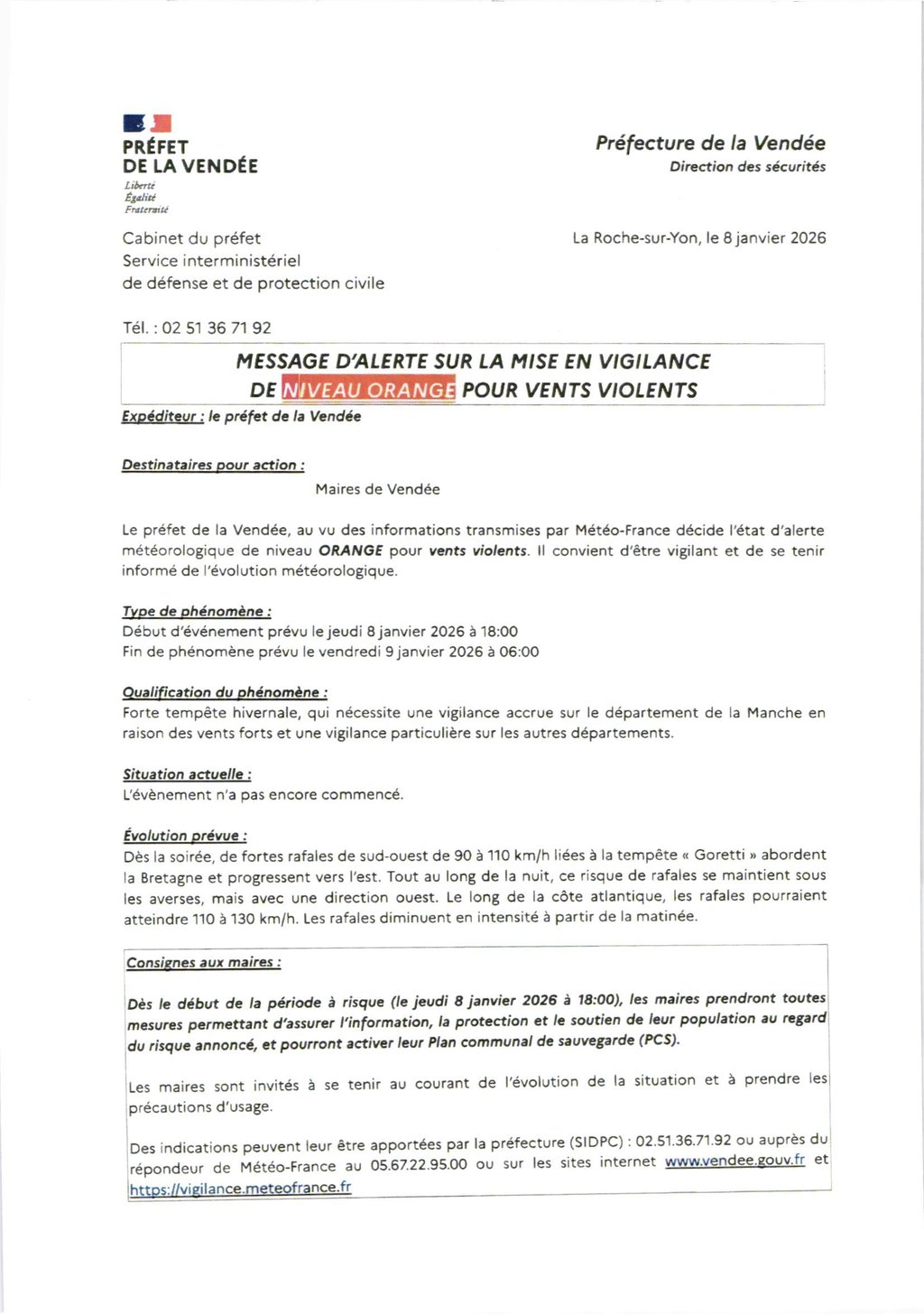 Soyez vigilants le département est en état d'alerte météorologique de niveau ORANGE pour vents violents à compter du jeudi 08 janvier 2026 à 18h00 jusqu'au vendredi 09 janvier 2026 à 06h00.