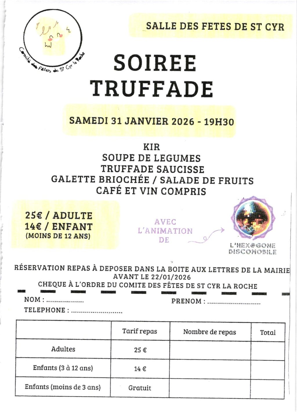 Le Comité des Fêtes de St Cyr La Roche vous invite à la SOIRÉE TRUFFADE le samedi 31 janvier à 19h30 à la salle des fêtes.