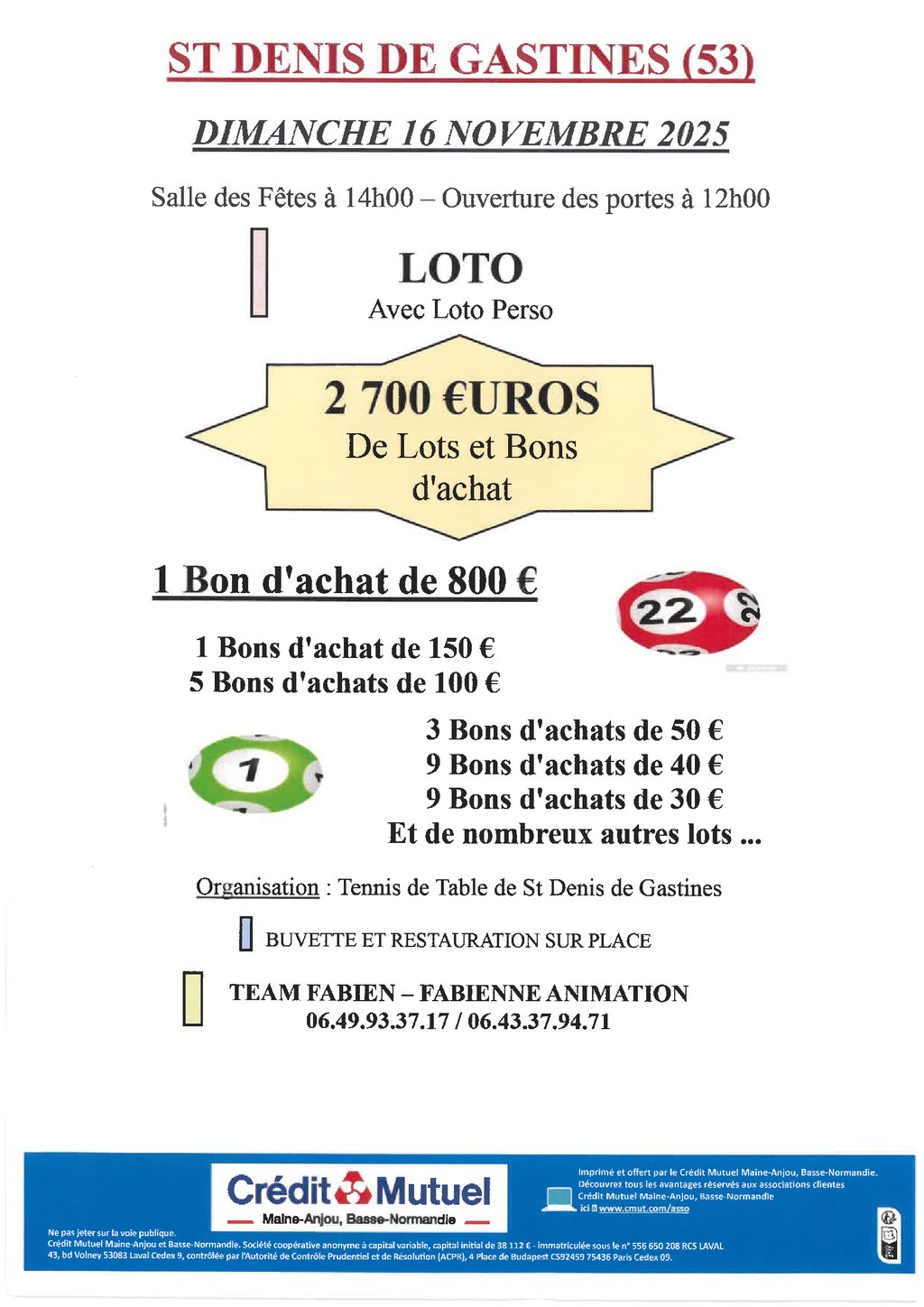 🎉 GRAND LOTO À ST DENIS DE GASTINES 🎉