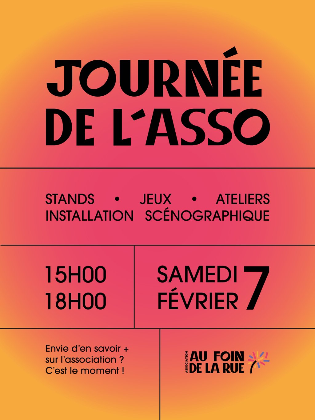 Ça tombe bien ! On vous invite lors d'une après-midi conviviale à en découvrir davantage sur ce qui se cache derrière Au Foin De La Rue. À travers des stands et des ateliers, on vous dit tout de nos actions et on prend le temps d'échanger avec vous. Pour le côté convivial, on a pensé à tout avec des jeux, des activités créatives, un bar et un goûter.