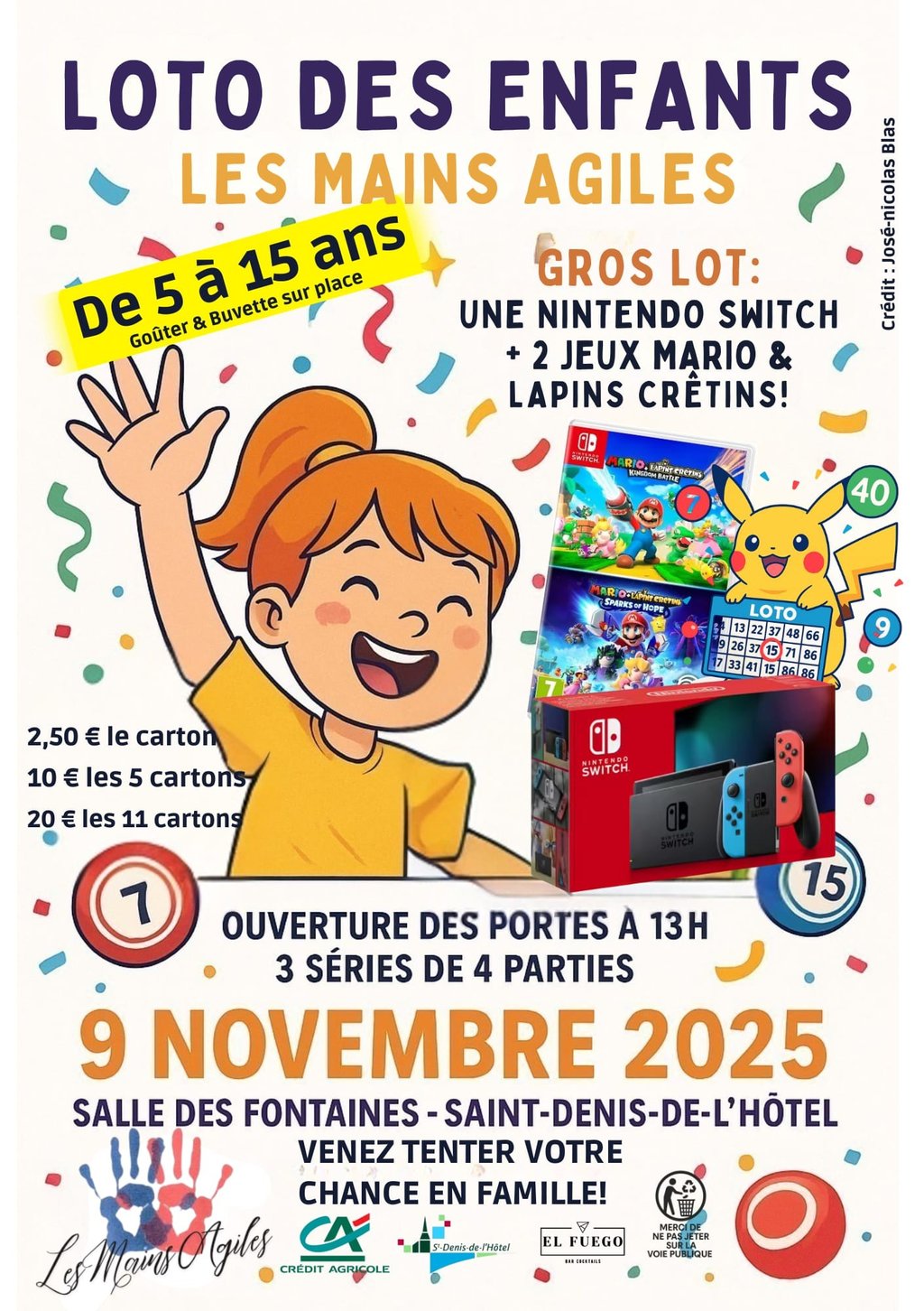 Les Mains Agiles proposent un loto dédié aux enfants de 5 à 15 ans, le Dimanche 9 Novembre 2025 à la Salle des Fontaines de Saint-Denis-de-l'Hôtel.