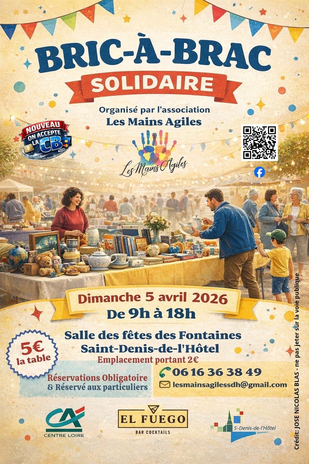 L’association Les Mains Agiles organise un Bric-à -brac solidaire ouvert à tous les dionysiens. L’événement se tiendra à la salle polyvalente des Fontaines de Saint-Denis-de-l'Hôtel le dimanche 5 avril 2026, de 9h à 18h.