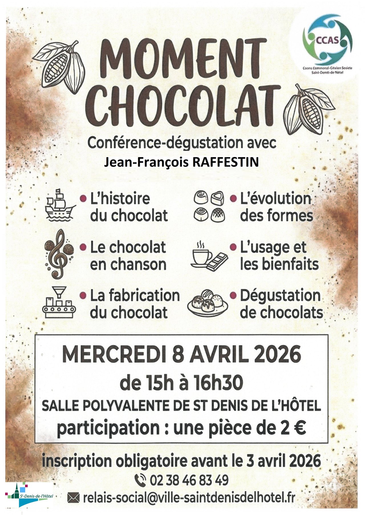 Avis aux amateurs de douceurs et aux curieux d'histoire : Le CCAS de Saint-Denis-de-l’Hôtel vous convie à une conférence exceptionnelle dédiée à l'univers du cacao.