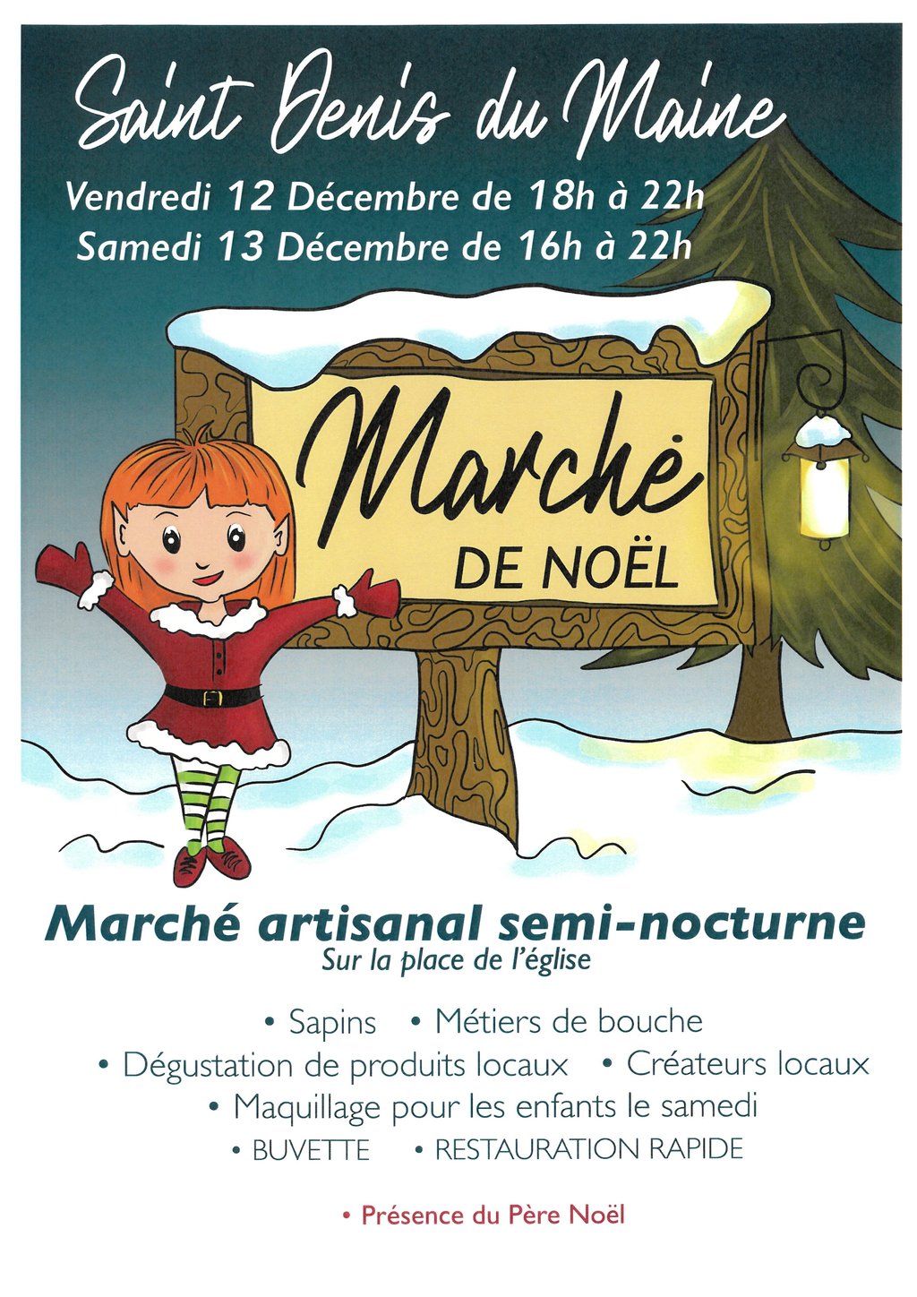 Le comité d'animation de Saint Denis du Maine est ravi de vous annoncer son traditionnel marché de Noël qui aura lieu le vendredi 12 décembre de 18 h à 22 h et le samedi 13 décembre de 16 h à 22 h sur la place de l'église.