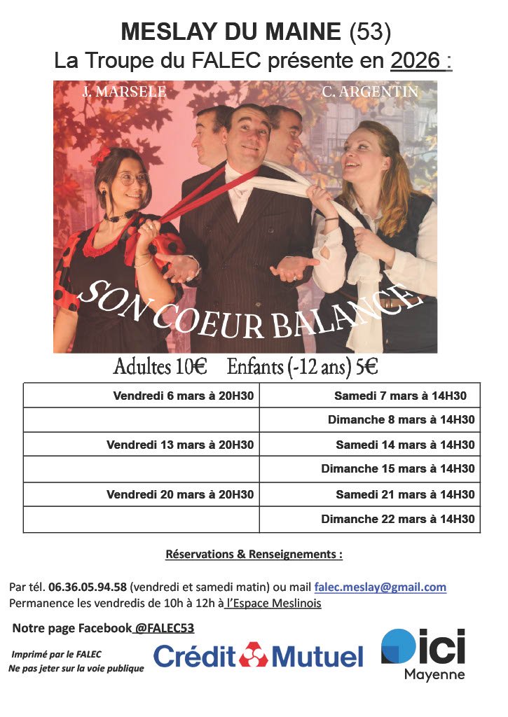 La troupe du Falec présente 9 séances théâtrales de " Son coeur balance" de J MARSELE et C. ARGENTIN.