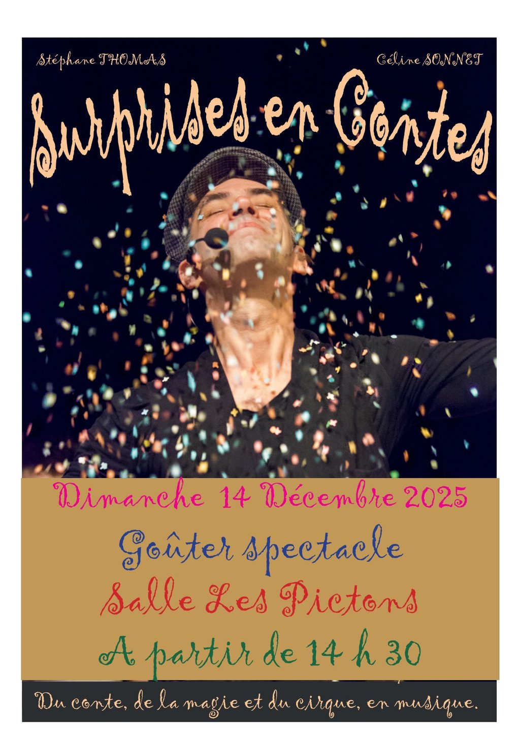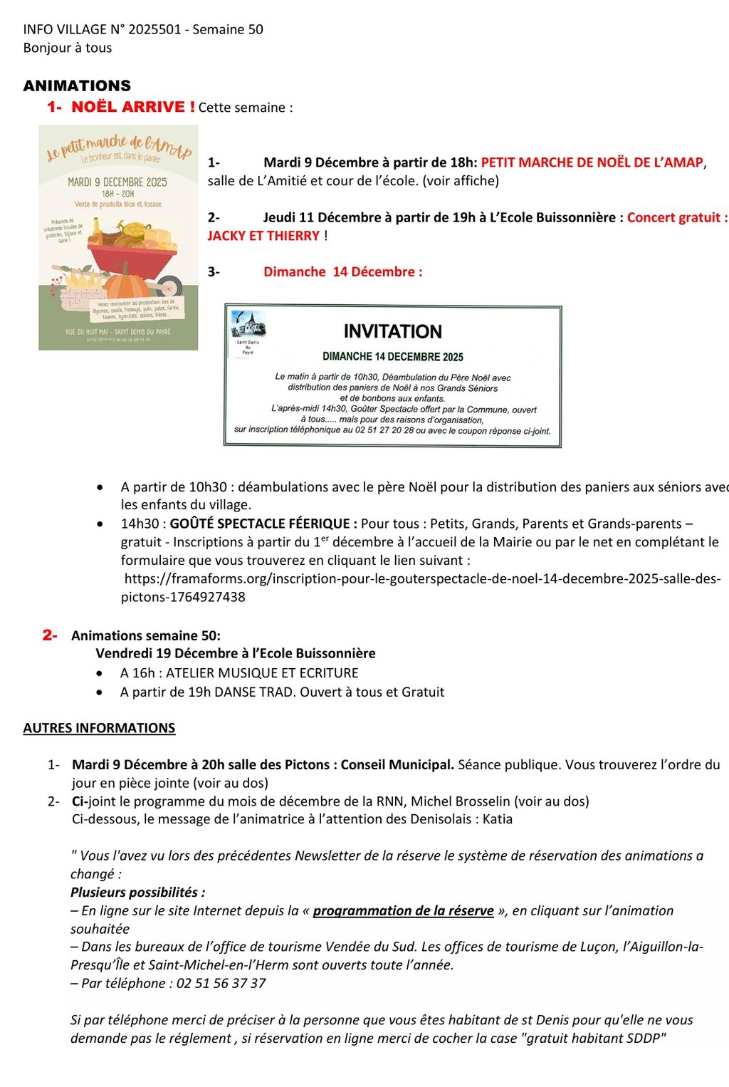 - 14h30 : GOÛTER/SPECTACLE FÉERIQUE : Pour tous : Petits, Grands, Parents et Grands-parents – gratuit - Inscriptions à partir du 1er décembre à l’accueil de la Mairie ou par le net en complétant le formulaire que vous trouverez en cliquant le lien suivant :