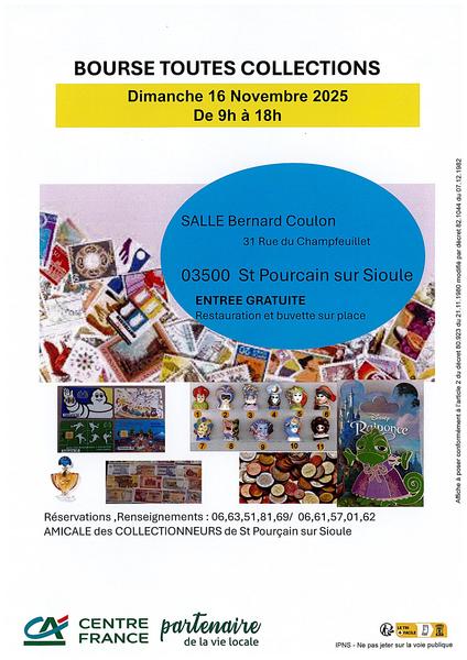 Amis collectionneurs, rendez-vous à la Bourse Toutes Collections de Saint-Pourçain-sur-Sioule ! Timbres, capsules, cartes postales... Venez chiner la pièce manquante de votre collection. Entrée gratuite ! Restauration et buvette sur place.
