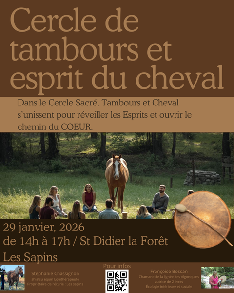 Voyage au rythme du tambour et du cœur, guidé par la présence sacrée du cheval. Chants amérindiens, force du cercle et énergie collective pour s’ancrer, s’ouvrir et guérir ensemble. Cercle animé par Françoise Bossan et Stéphanie Chassignon.