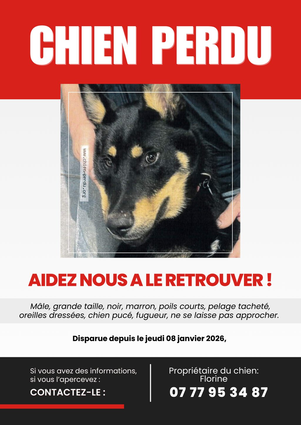 Vous l’apercevez ou avez des informations, merci de contacter Florine la propriétaire du chien au 07 77 95 34 87