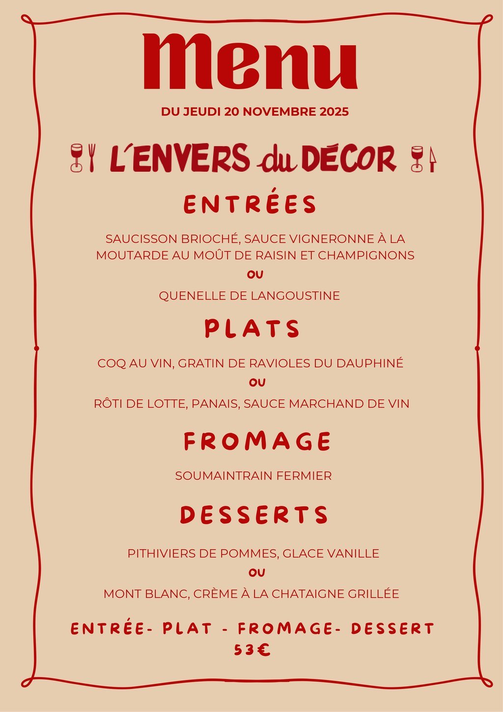 À l’occasion de la sortie du Beaujolais nouveau, L’Envers du Décor vous invite à une soirée gourmande et conviviale autour d’un menu spécial Beaujolais.