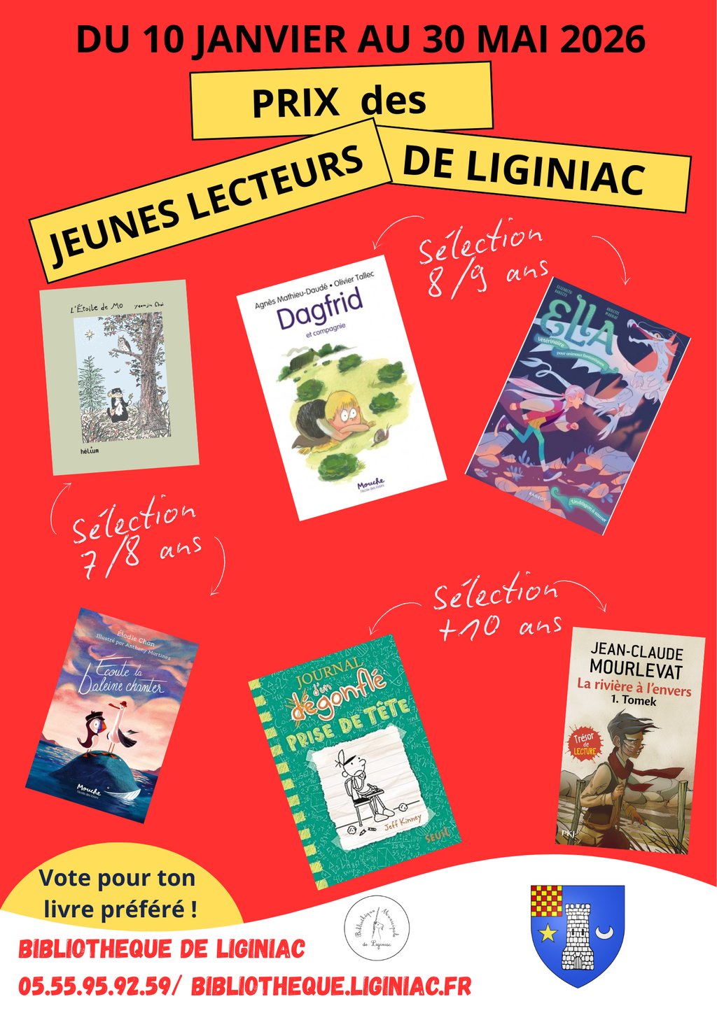 La présentation des ouvrages sélectionnées pour le prix des jeunes lecteurs de Liginiac Une sélection est proposée pour chaque tranche d’âge : 7/8 ans, 8/9ans et +10 ans. Les plus jeunes (- 7ans) auront la possibilité de choisir leur album préféré à l’école ou à la bibliothèque avec le prix départemental de l’album jeunesse proposé par la bibliothèque départementale.
