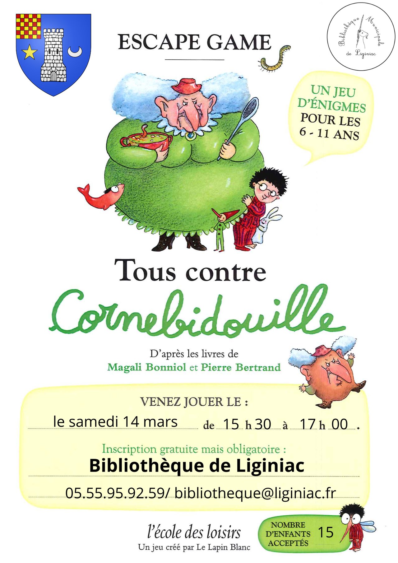 Samedi 14 mars de 15h30 à 17h : Un escape game dans la bibliothèque pour les enfants de 6 à 11 ans. Inscription gratuite mais obligatoire. Limité à 15 enfants.