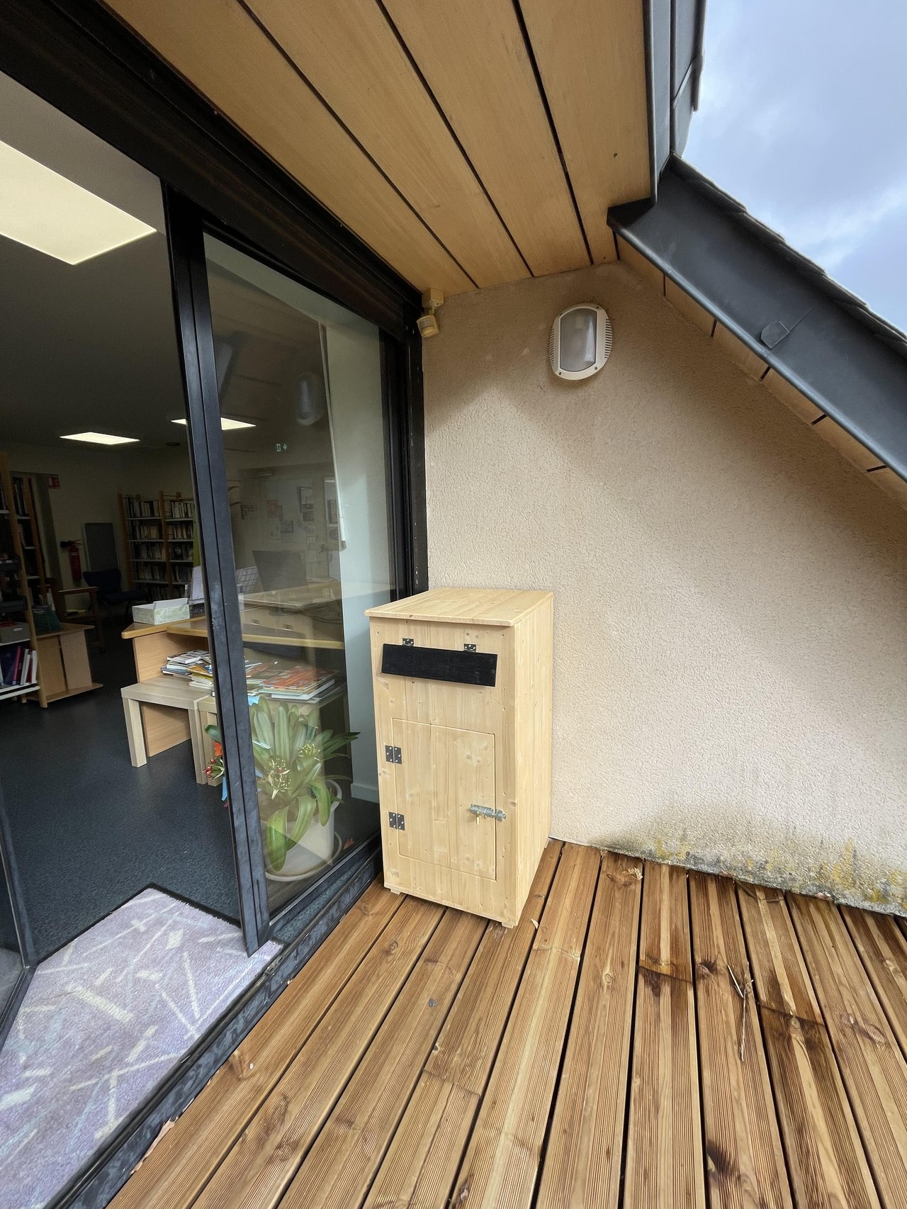 Rappel : La boite de retour se situe sous l'auvent de la terrasse de la bibliothèque, sur votre gauche quand vous êtes à la porte d'entrée de la salle des fêtes. (Voir photo ci-dessus).