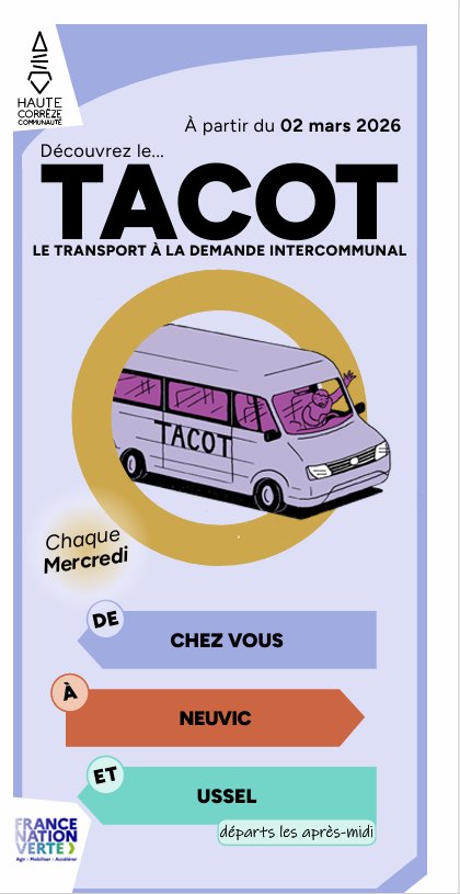 Depuis le 2 mars Haute-Corrèze Communauté a lancé le Tacot, un service de transport à la demande pensé pour faciliter vos déplacements quotidiens sur l’ensemble du territoire.
