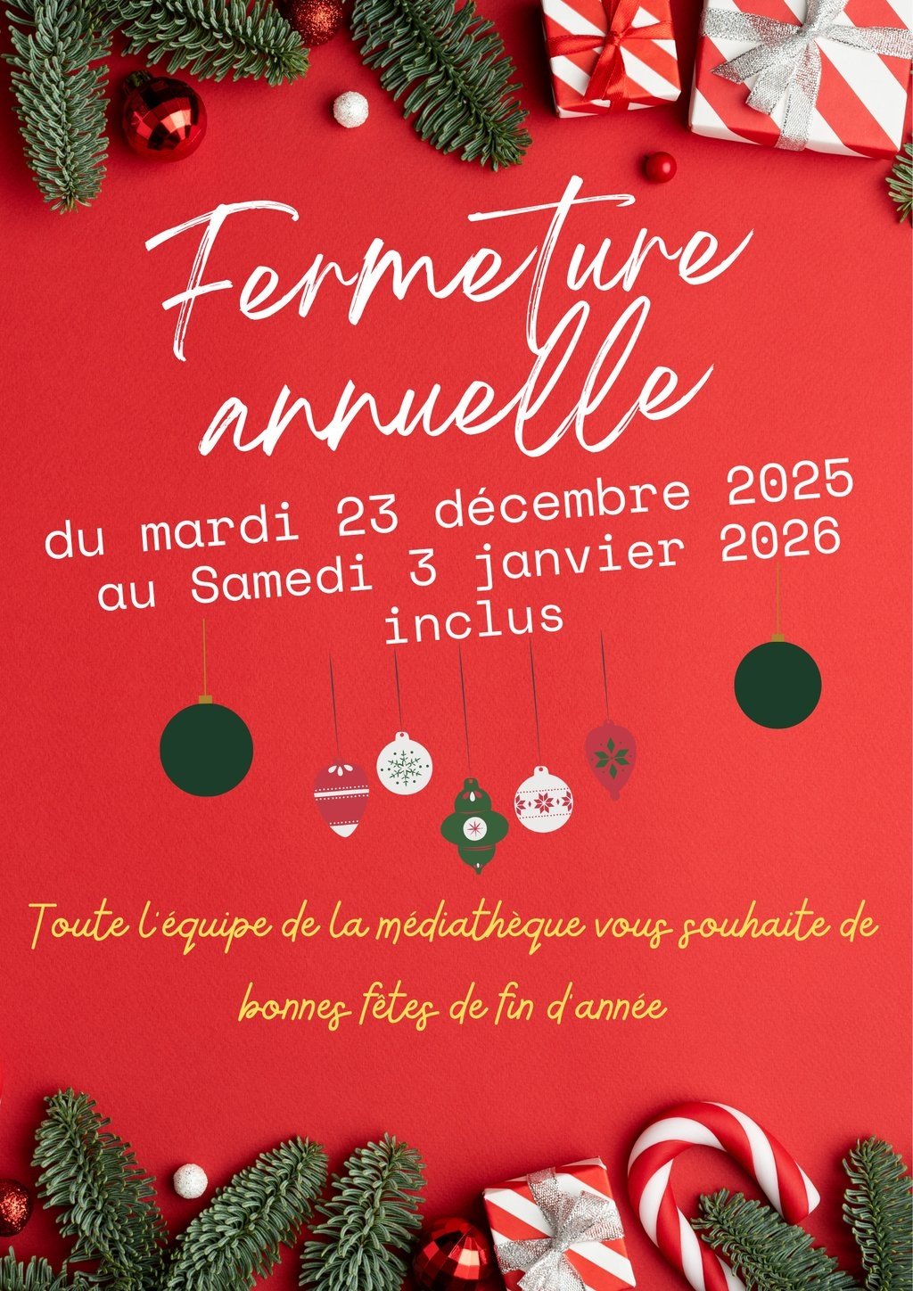 Fermeture hivernale de la médiathèque du mardi 23 décembre 2025 au samedi 3 janvier 2026 inclus.