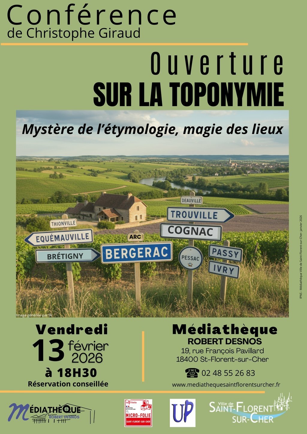 Pour en savoir plus sur leur empreinte linguistique, Christophe Giraud, docteur en géographie, vous convie à une conférence Ouverture sur la toponymie en partenariat avec l’Université Populaire du Berry à la médiathèque de Saint-Florent-sur-Cher, le vendredi 13 février 2026 à 18H30.