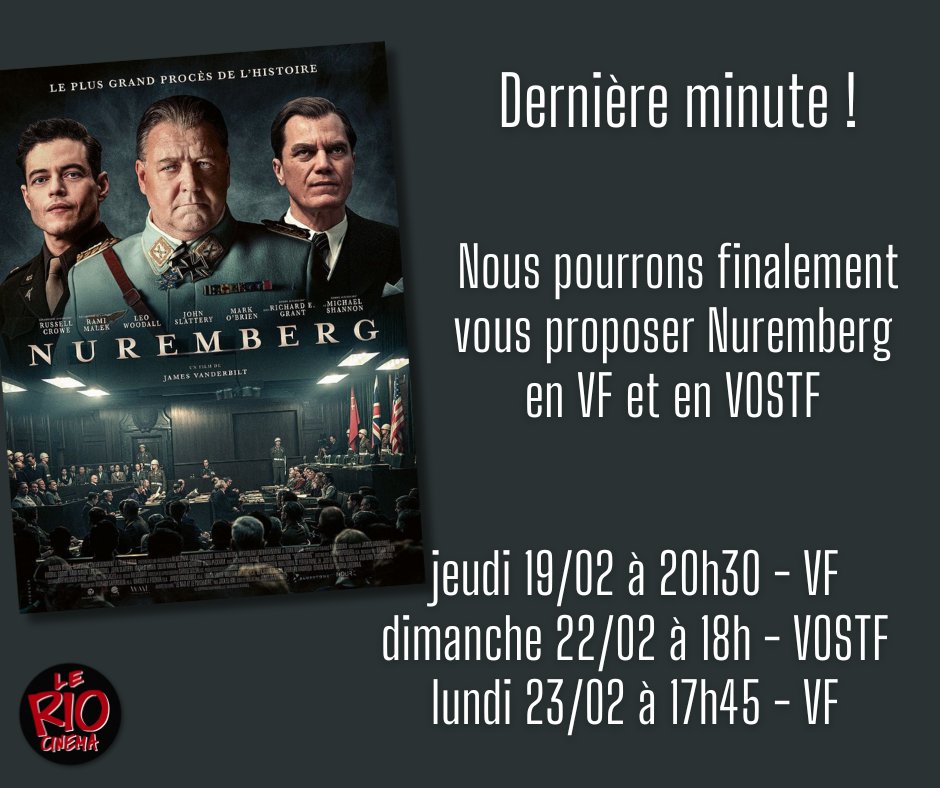 Le Rio est heureux de vous annoncer que nous serons finalement en mesure de vous proposer la projection de NUREMBERG en VF et en VOSTF :