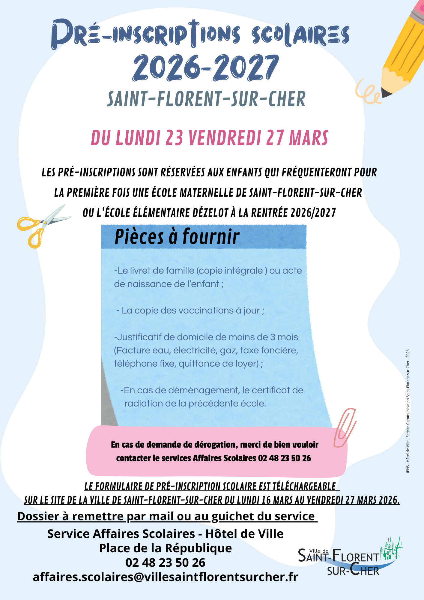 SAINT-FLORENT-SUR-CHER : PRÉINSCRIPTIONS RENTRÉE SCOLAIRE 2026/2027