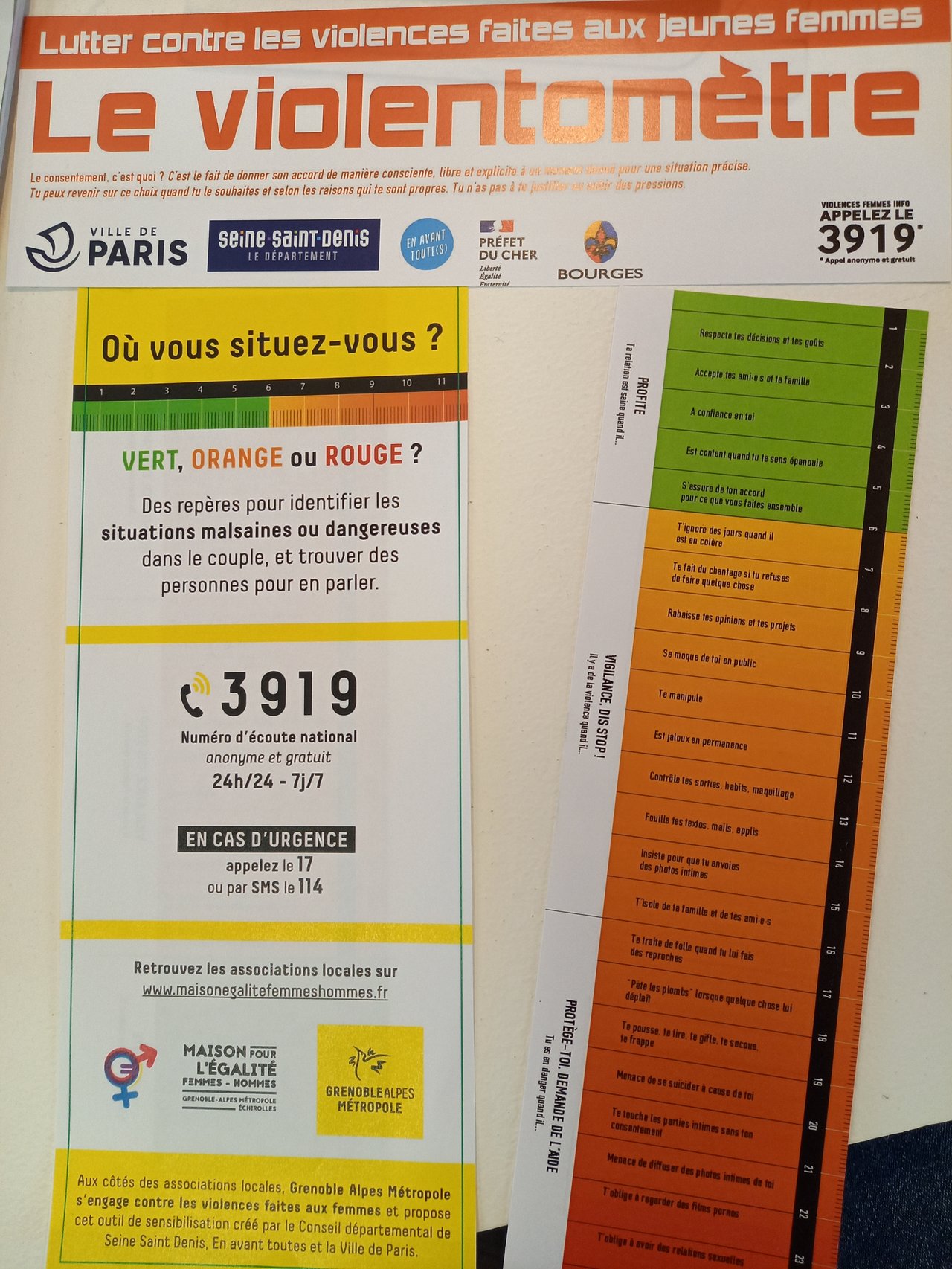 Des numéros essentiels : 3919 (numéro d'écoute national - anonyme et gratuit). Appel au 17 ou SMS le 114 en CAS D'URGENCE.