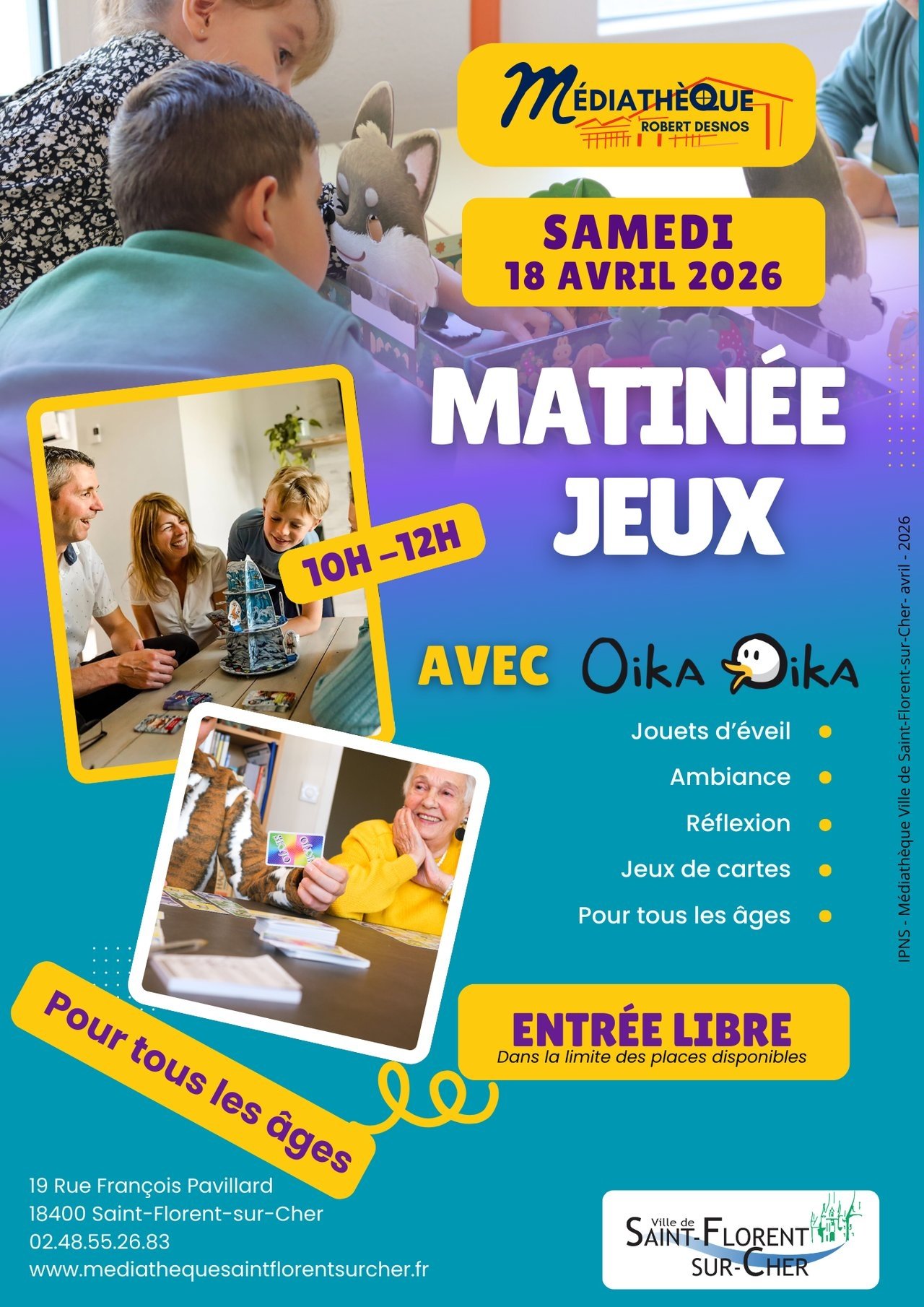 Venez partager un moment convivial et ludique en compagnie dâAdeline de Oika Oika lors dâune matinĂ©e jeux Ă la mĂ©diathĂšque, le samedi 18 avril 2026, de 10h Ă 12h.