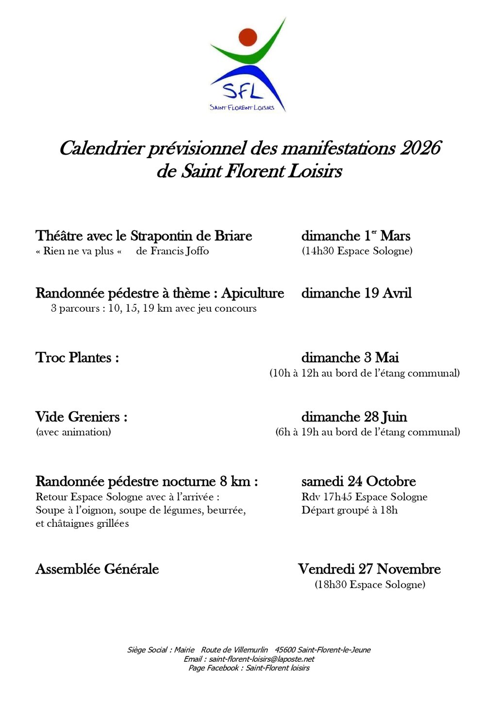 Calendriers des manifestations de l'association SAINT FLORENT LOISIRS pour l'année 2026