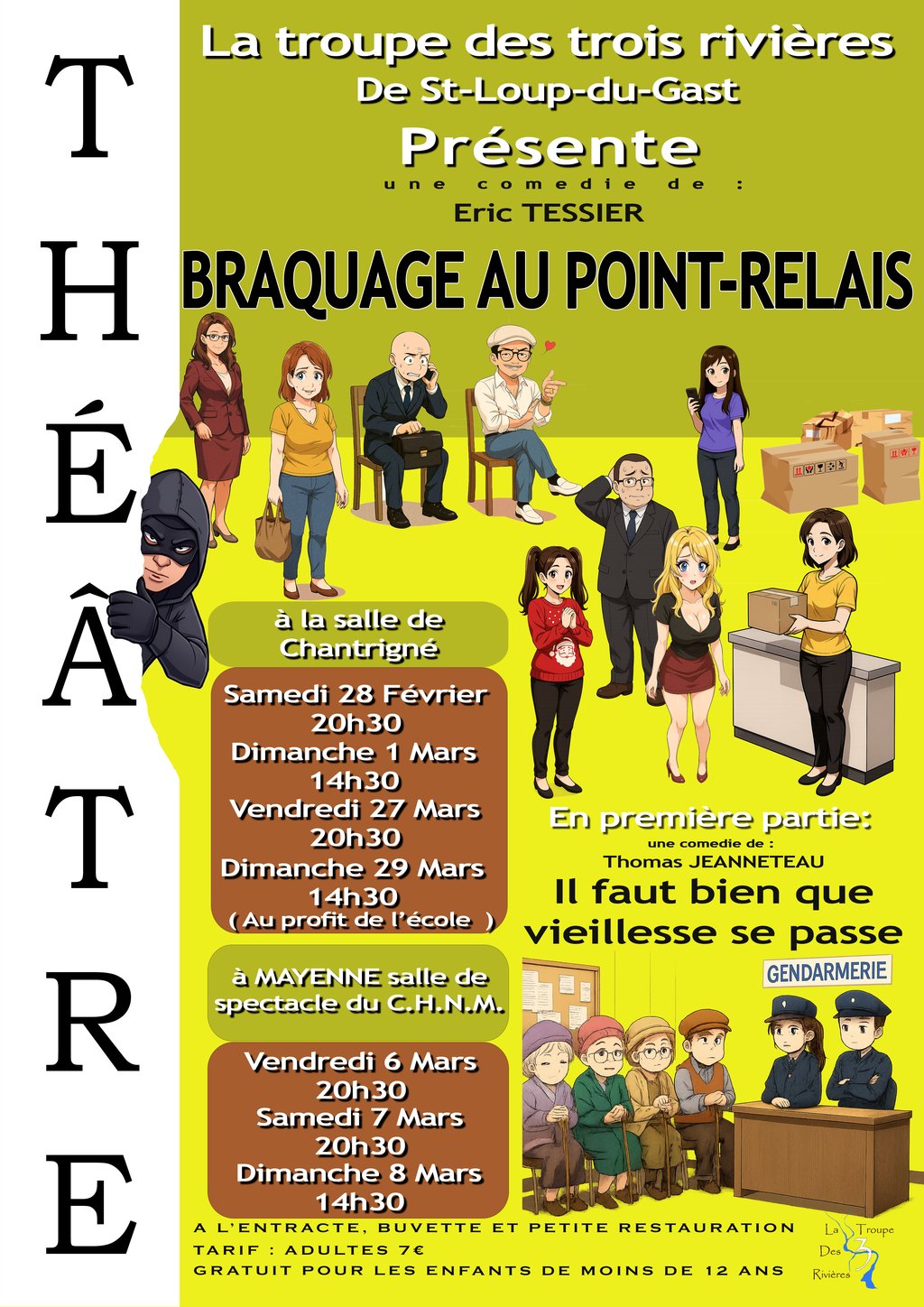 Samedi 28 février (20h30), dimanche 1er mars (14h30), vendredi 27 mars (20h30), Dimanche 29 mars (14h30) : à la salle de Chantrigné.