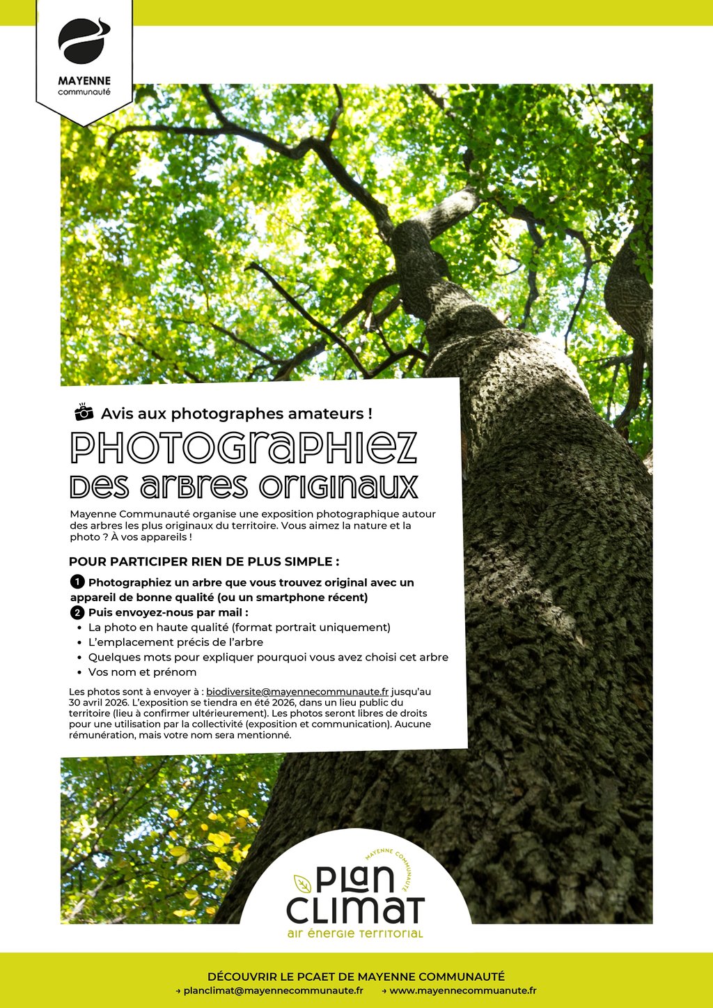 L’objectif est de mettre en valeur les arbres qui nous entoure et qui font de notre paysage un lieu d’exception. Tous les habitants de Mayenne Communauté peuvent exprimer leur attachement et leur regard sur le bocage ou les arbres isolés à travers une photo qu’ils enverront à biodiversite@mayennecommunaute.fr avant le 30 avril 2026.