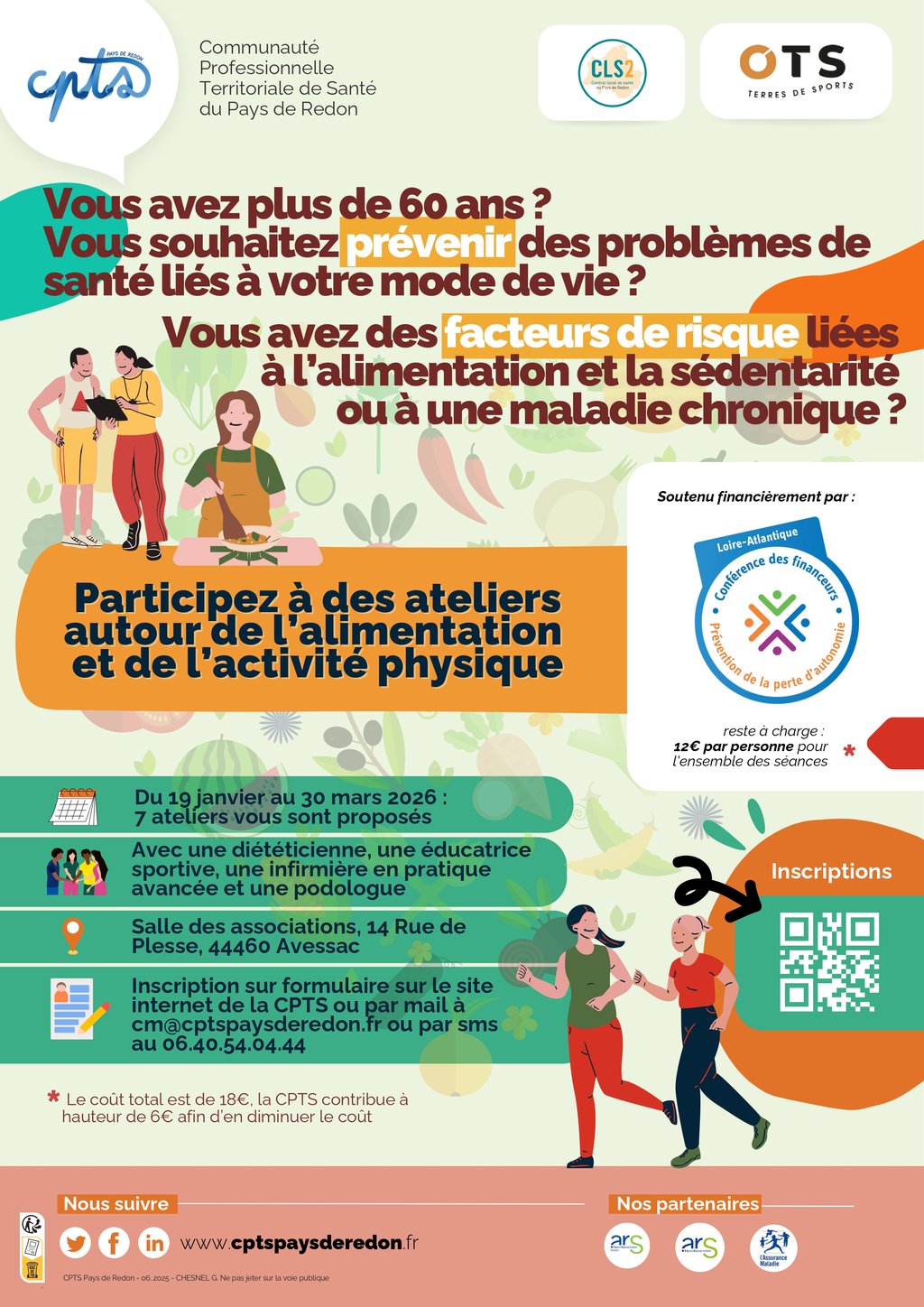 La CPTS propose du 19 Janvier 2026 au 30 mars 2026, 7 ateliers autour de l'alimentation et l'activité physique à destination des personnes de 60 ans et plus, animés notamment par une diététicienne et une éducatrice sportive.