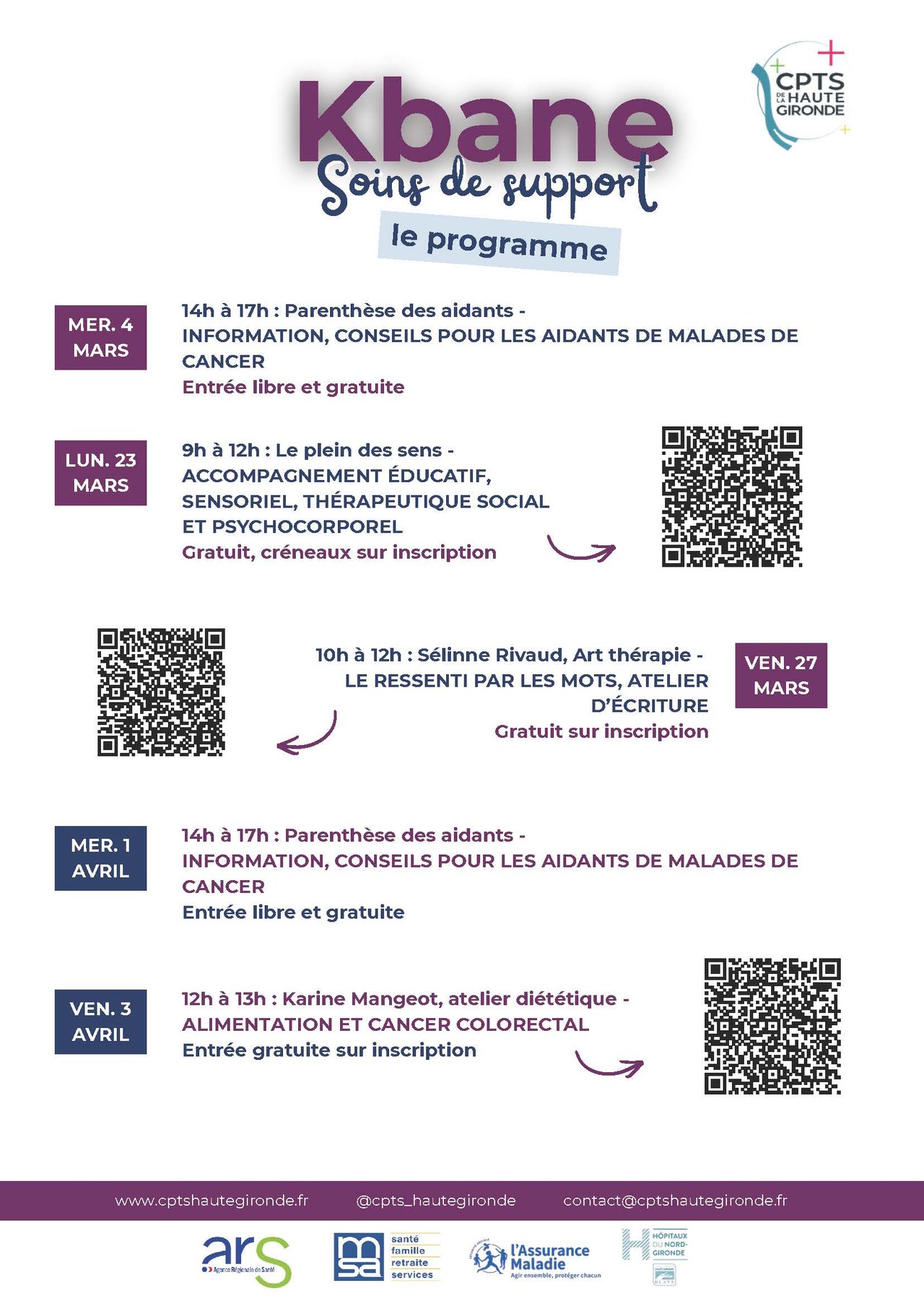 📅 Ateliers de mars à juin Programme complet disponible sur : 🌐 Ça bouge à la Kbane soins de support ! - CPTS Haute Gironde