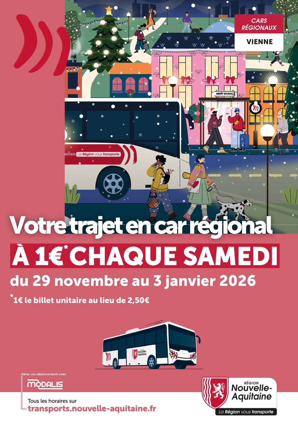 À l'approche des fêtes de fin d'année, nous avons le plaisir de vous annoncer le lancement d'une offre exceptionnelle sur notre réseau de transport : "Samedi à 1€", valable du 29 novembre 2025 au 03 janvier 2026 inclus.