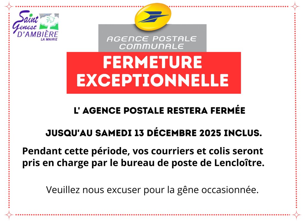 L’agence postale sera fermée jusqu’au samedi 13 décembre 2025 inclus.