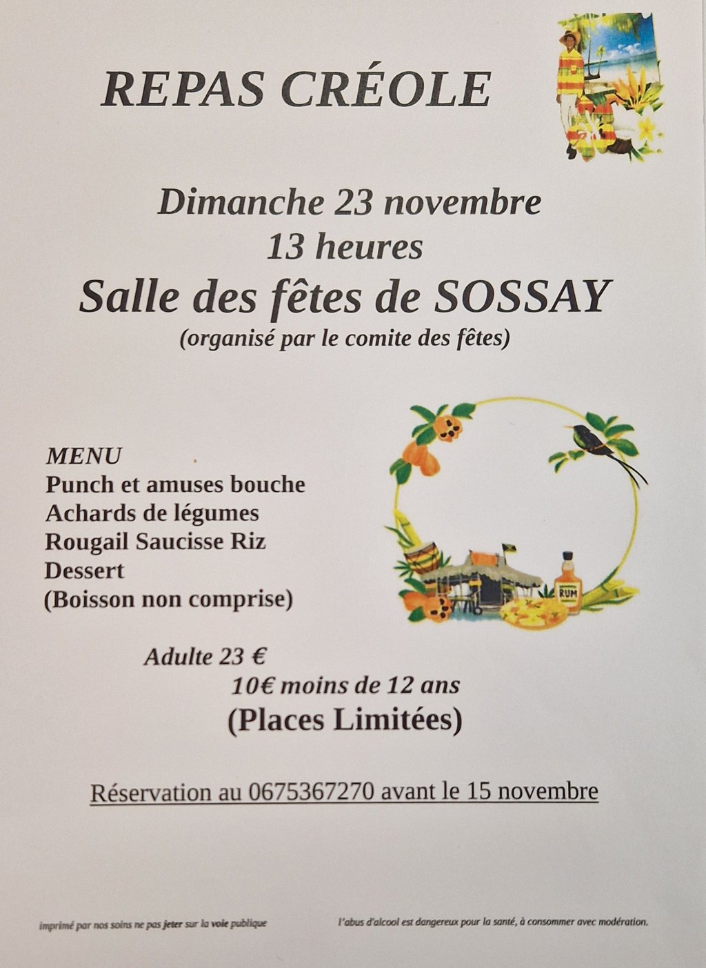 Le comité des fêtes de Sossay organise un repas créole le dimanche 23 novembre à 13h, à la salle des fêtes de Sossay.