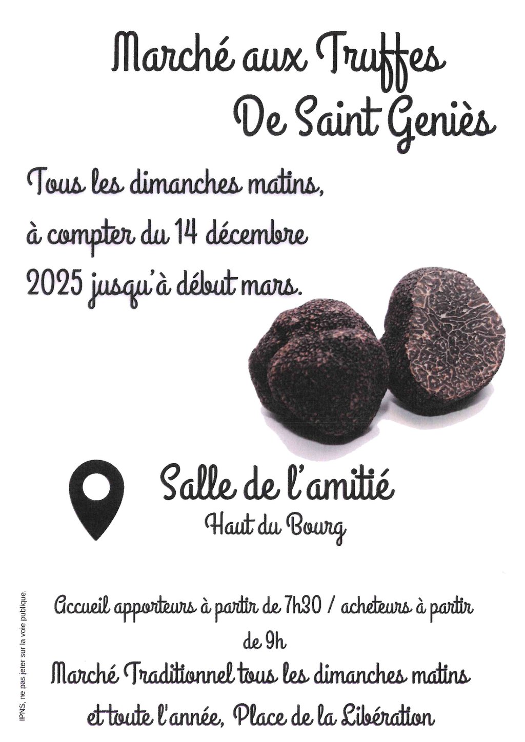 MARCHÉ AUX TRUFFES DE SAINT-GENIÈS, C'EST REPARTI ET C'EST CE DIMANCHE À LA SALLE DE L'AMITIÉ !