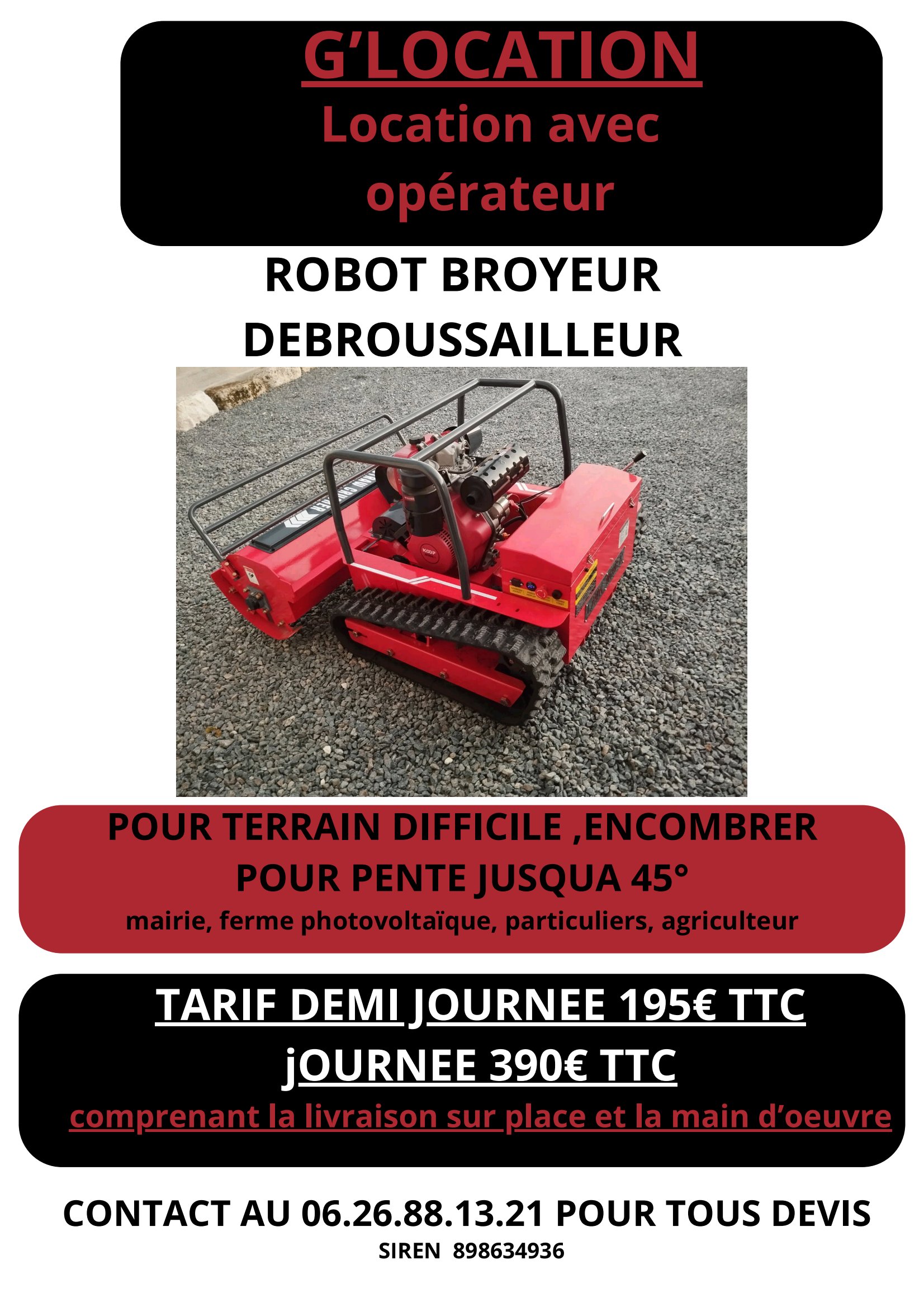 Je vous propose mes services de location de mes robots broyeur débroussailleur télécommandé pour terrain difficile d'accès pente jusqu’à 45° utile pour parcelle encombré par des ronciers géants, herbes épaisses, arbustes ......