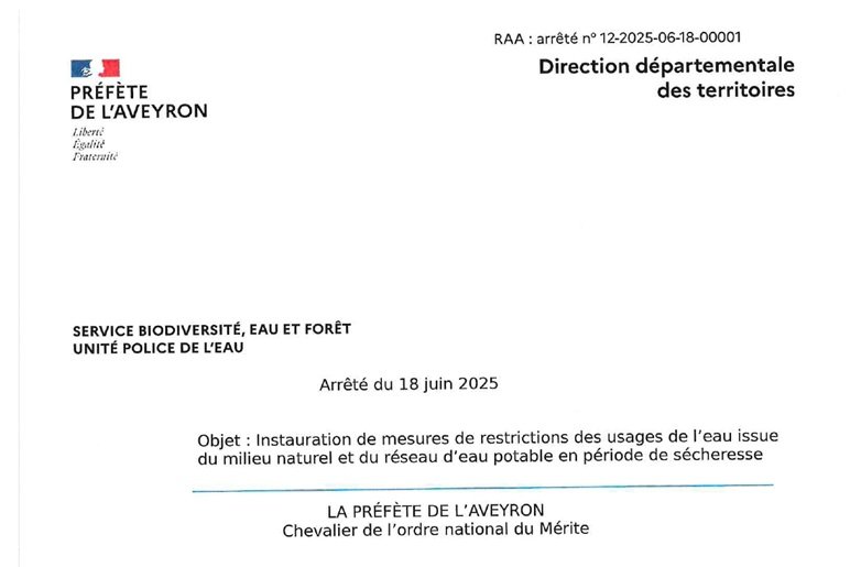 Plus d'information sur le site suivant : https://www.aveyron.gouv.fr/Actions-de-l-Etat/Environnement/Gestion-de-l-eau/Secheresse/Arretes-de-restrictions .