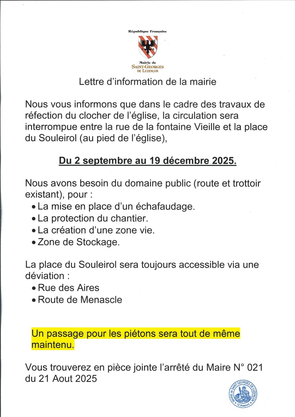 ARRETE DU MAIRE A2025-021 : TRAVAUX DE RÉHABILITATION DU CLOCHER DE L’ÉGLISE AVEC MISE EN PLACE D’UN ÉCHAFAUDAGE