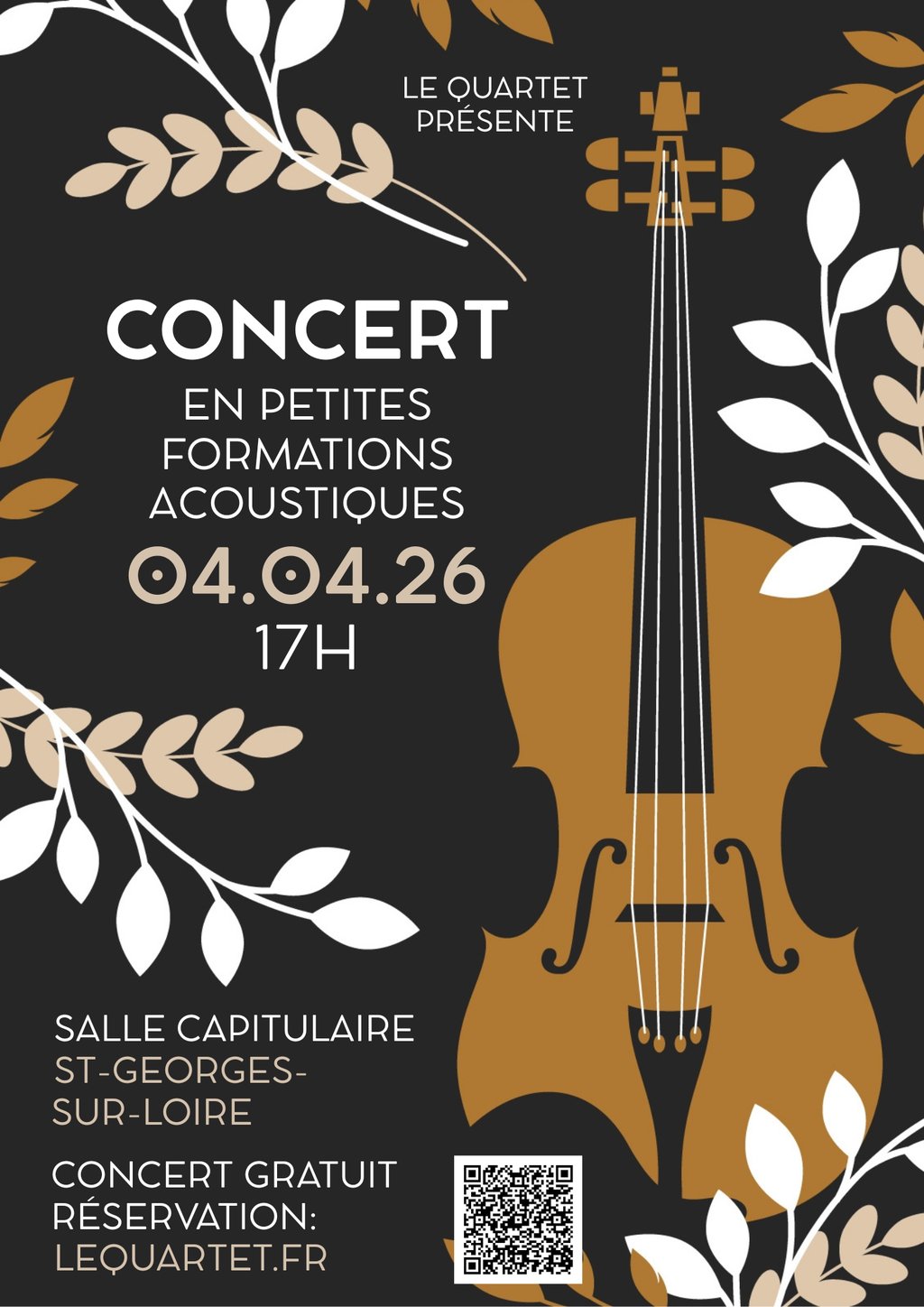 Les élèves de l'école de musique et danse Le Quartet donneront un concert gratuit en la Salle Capitulaire de Saint-Georges-sur-Loire le samedi 4 avril. Réunis en petites formations (duos, trios, quatuors...) de plusieurs instruments, ils aborderont un répertoire varié, allant du classique à la variété, en passant par la musique traditionnelle et la musique du monde. L’événement est ouvert à tous, le détail du programme sera communiqué ultérieurement sur le site de l'école : Lequartet.fr.
