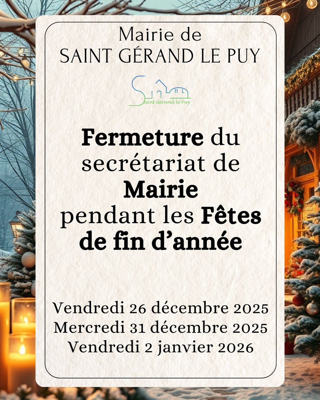 FERMETURE DU SECRÉTARIAT DE MAIRIE PENDANT LES FÊTES DE FIN D'ANNÉE