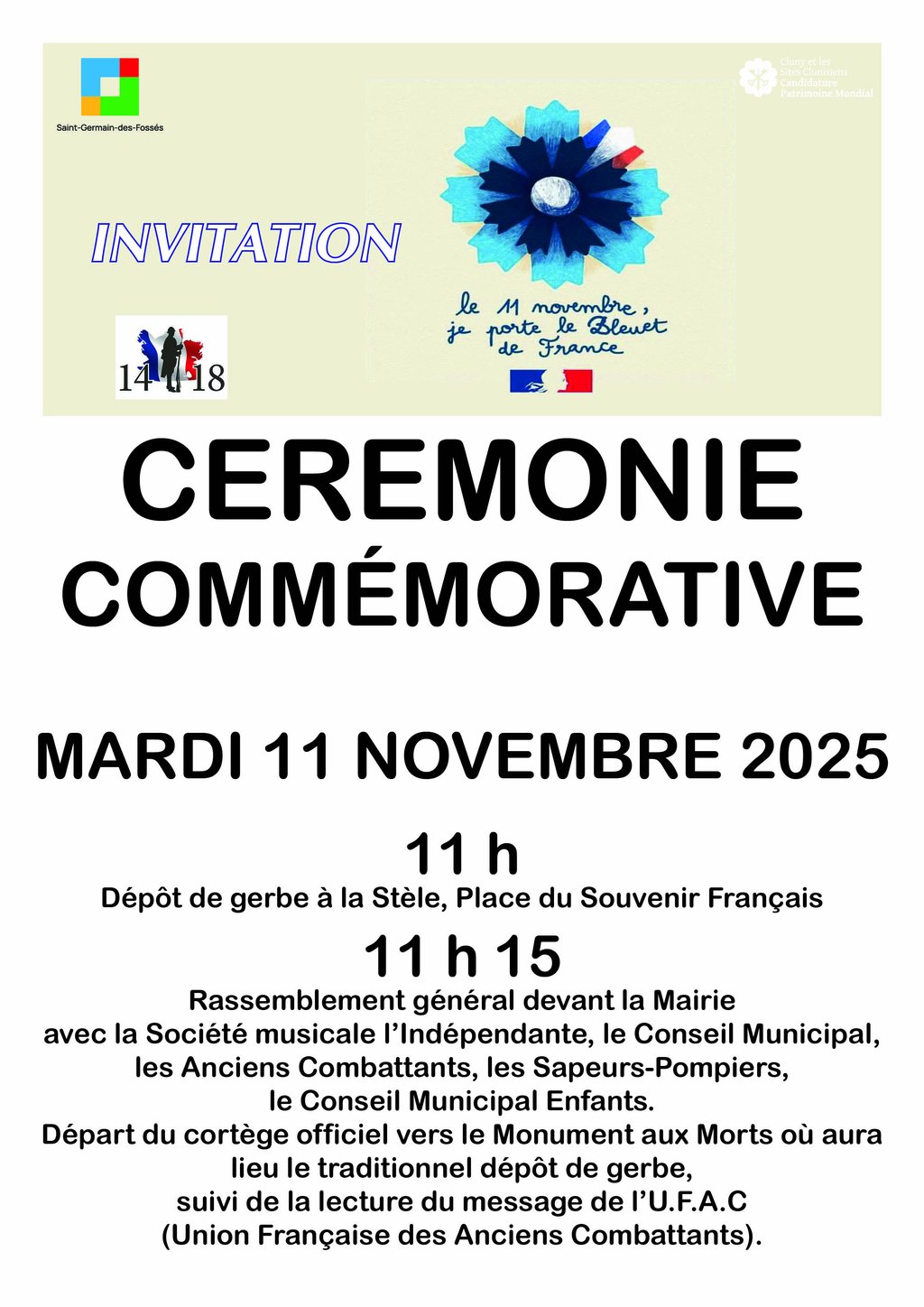 Départ du cortège officiel vers le Monument aux Morts où aura lieu le traditionnel dépôt de gerbe, suivi de la lecture du message de l’U.F.A.C (Union Française des Anciens Combattants) et de lectures d’élèves de 3ème du collège Jean-de-la-Fontaine.