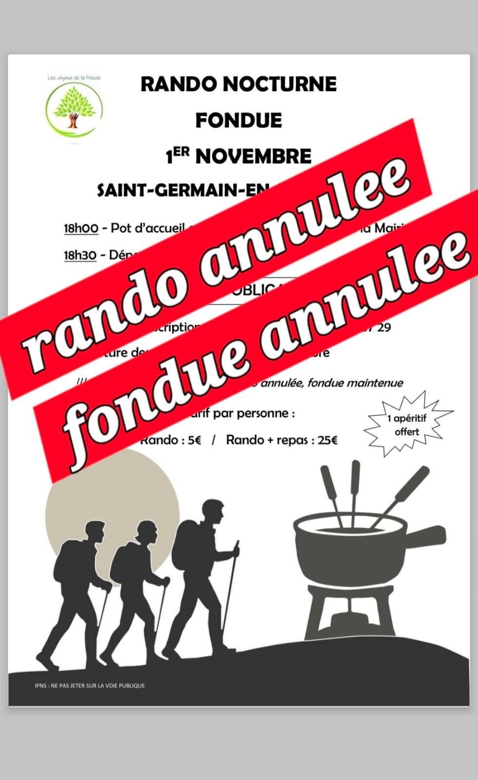 Avec la météo défavorable, nous pensions maintenir la fondue et annuler juste la rando. Mais un souci avec le prestataire de la fondue nous oblige malheureusement à tout annuler.