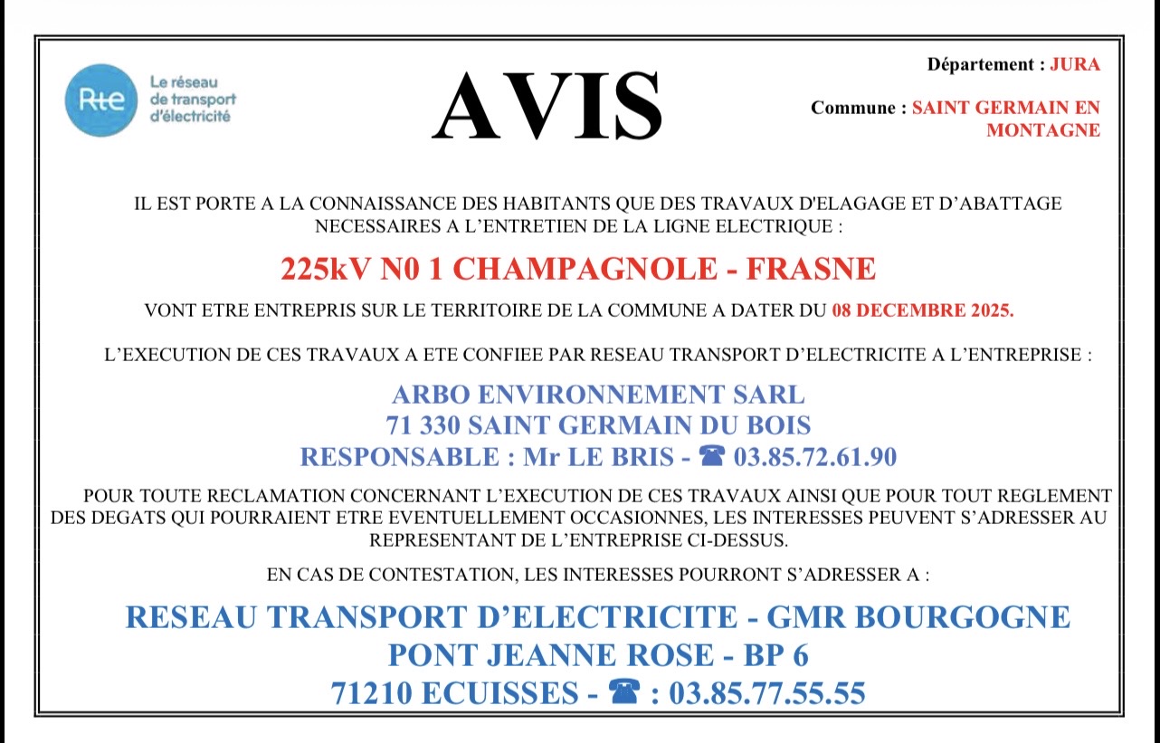 Des travaux d’élagage et d’abattage auront lieu à partir du 8 décembre 2025 pour l’entretien de la ligne électrique 225 kV Champagnole–Frasne.
