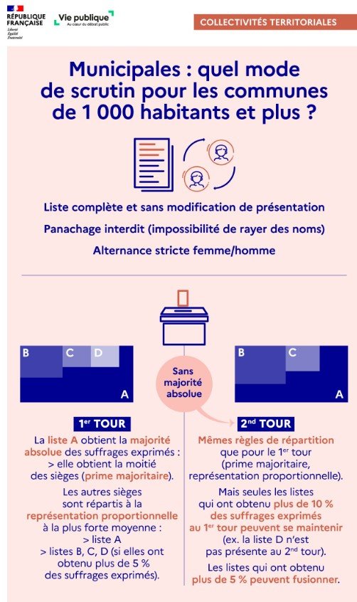 - Dans les communes de 1 000 habitants et plus, le scrutin est proportionnel, de liste, paritaire à deux tours avec prime majoritaire accordée à la liste arrivée en tête.