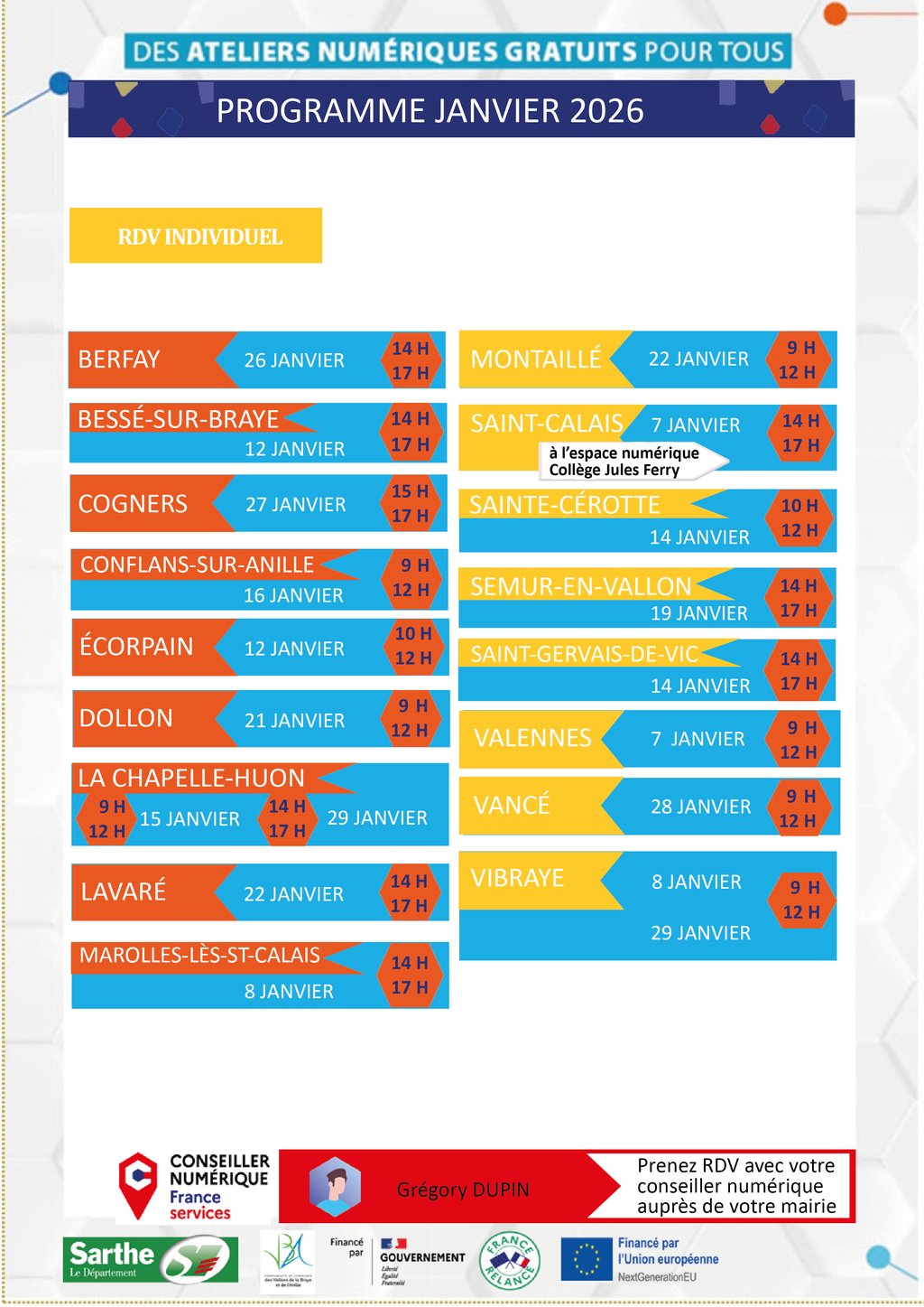 Découvrez les dates de permanence du conseiller numérique dans vos communes pour le mois de janvier 2026 et inscrivez-vous auprès de votre mairie.