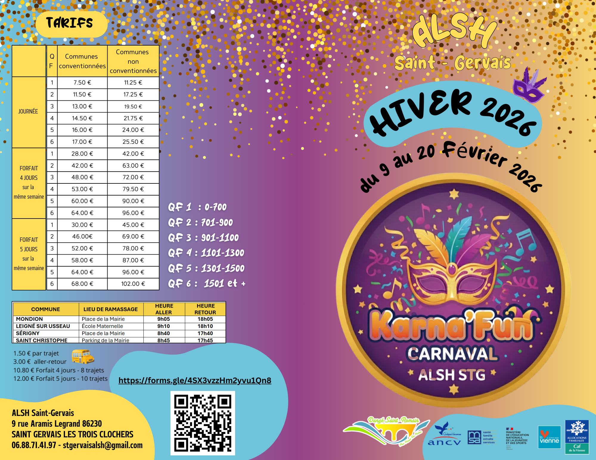 L'ALSH vous propose d'assister au carnaval KARNA'FUN organisé le 18 février 2026 à partir de 17h30. Crêpes party entre 16h30 et 17h30.