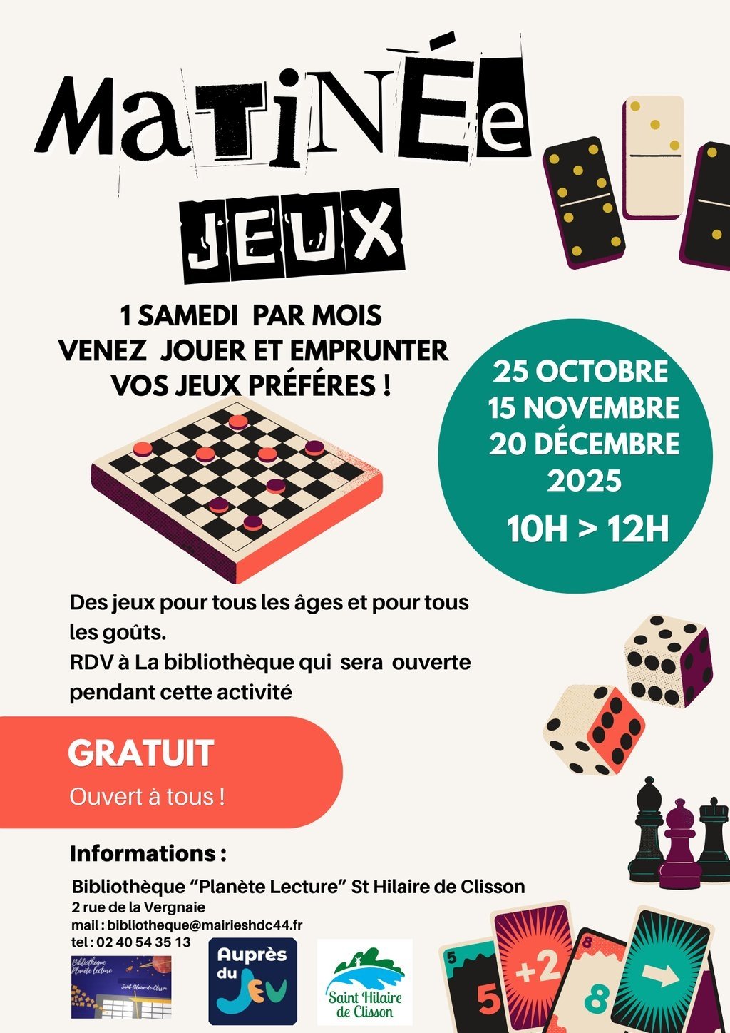 En partenariat avec la ludothèque "auprès du Jeu", la bibliothèque Planète lecture vous propose un nouveau service les matinées jeux. Un samedi matin par mois, venez en famille ou entre amis découvrir ou redécouvrir de nouveaux jeux de société, de bricolage et d'éveil.