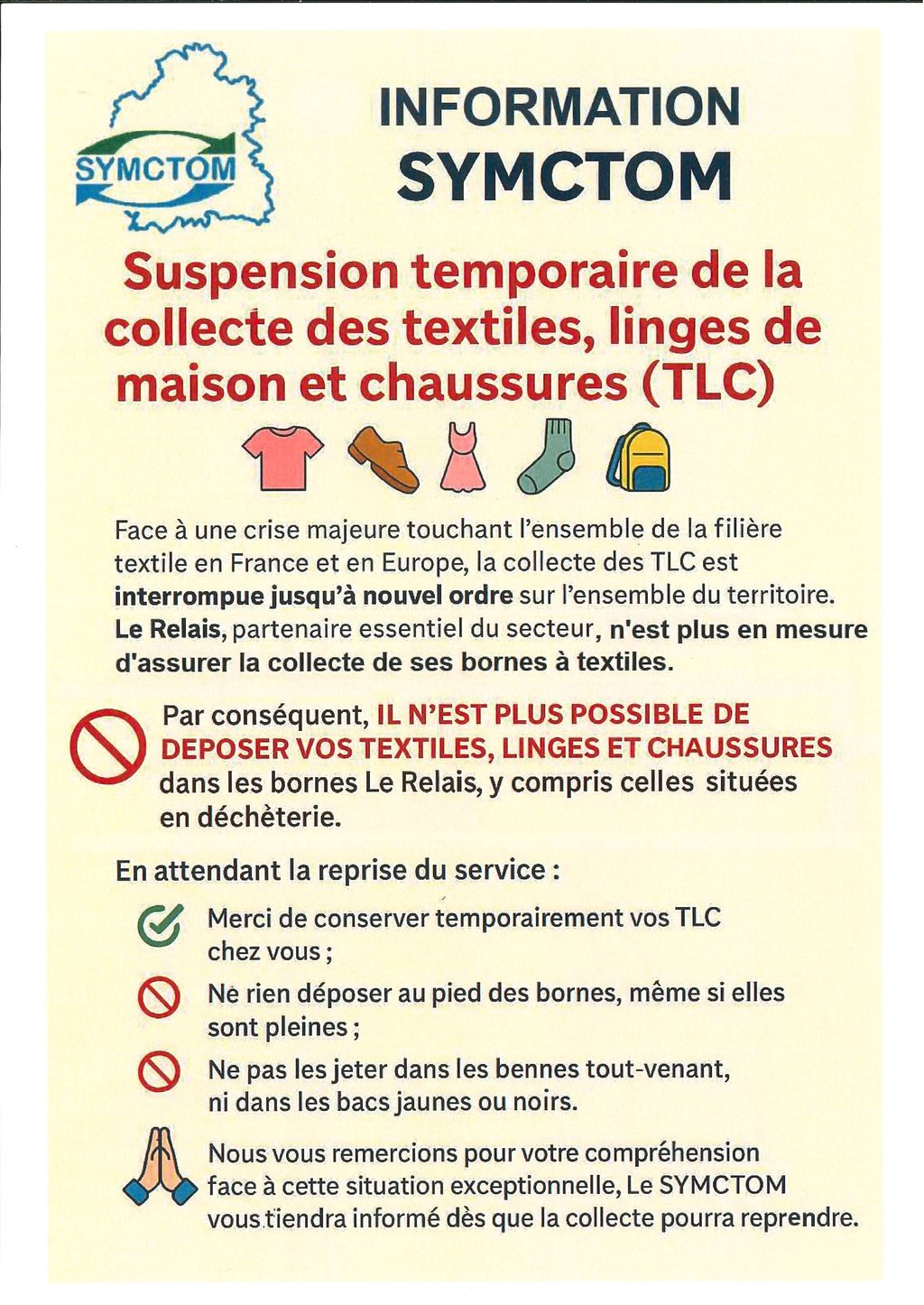 Une crise majeure touchant l'ensemble de la filière textile en France et en Europe , la collecte des textiles, linges de maison et chaussures est interrompue jusqu'à nouvel ordre.