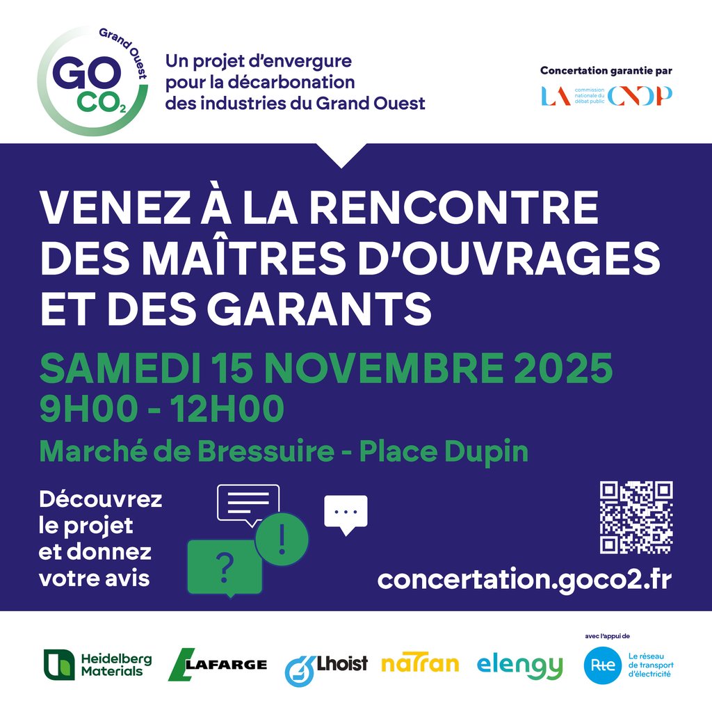 Dans le cadre de la concertation préalable du projet GOCO2, une rencontre de proximité se tiendra le samedi 15 novembre en présence de l'équipe projet, de 9h à 12h, au marché de Bressuire.
