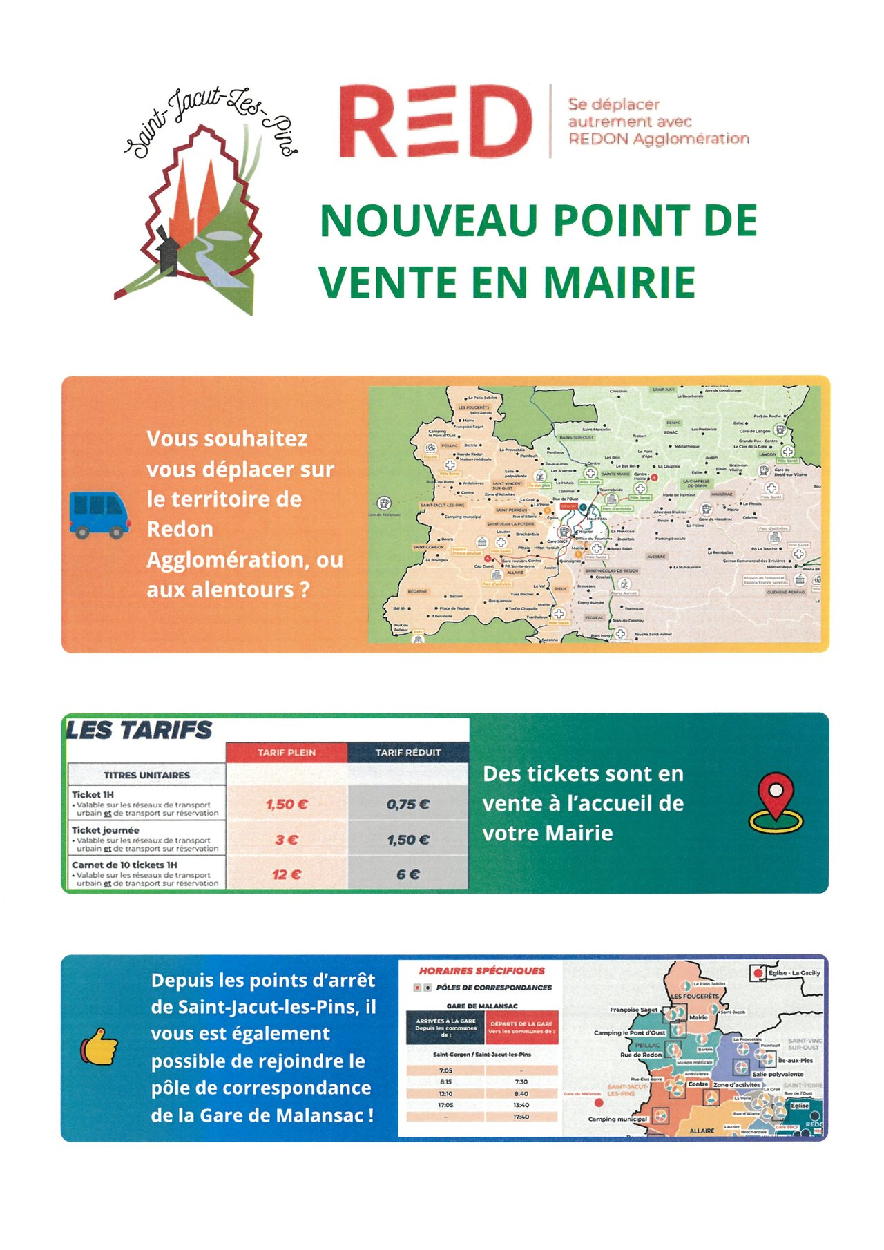 La vente des tickets se fait en Mairie, cependant, pour la réservation du Transport, merci de contacter le RED du lundi au vendredi de 9 h 00 à 17 h 00 au 02.30.24.25.26 ou par mail à l'adresse reservation@red.bzh (à minima la veille pour le lendemain)