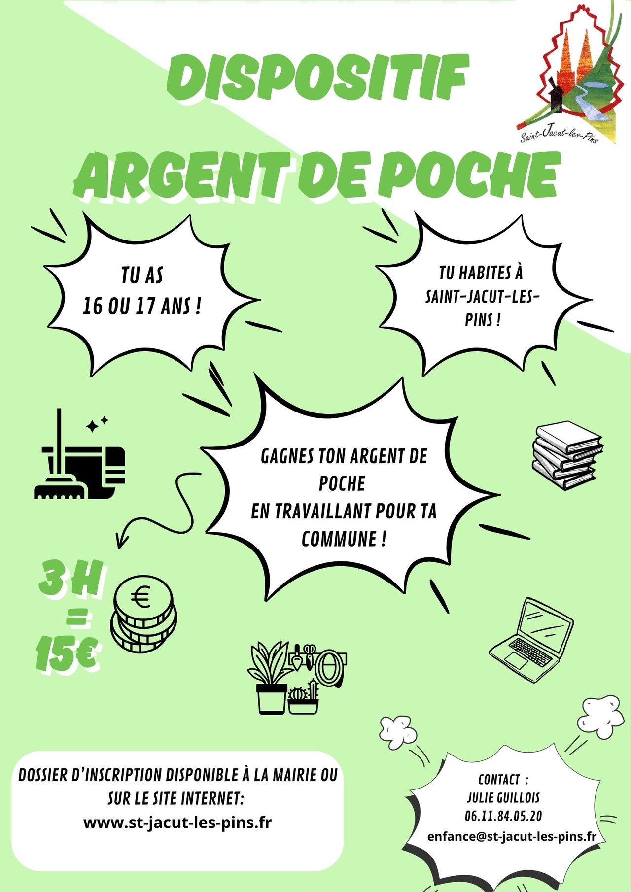 Pour plus de renseignements, n’hésites pas à contacter Julie GUILLOIS (responsable enfance) à enfance@st-jacut-les-pins.fr ou 06.11.84.05.20